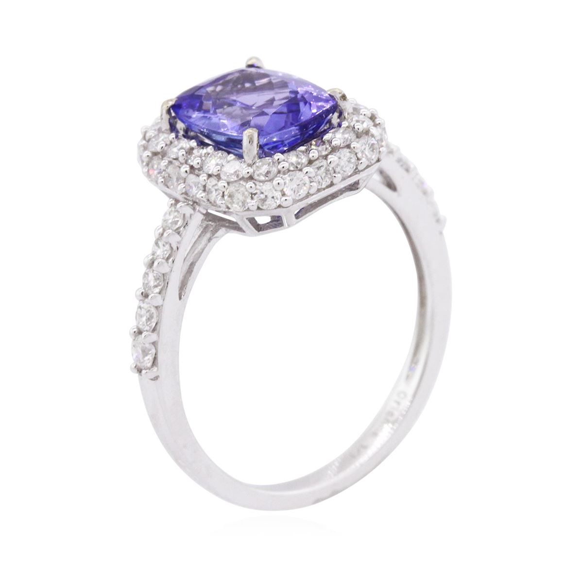 One electronically tested 14KT white gold ladies cast tanzanite & diamond ring with a bright finish. The featured tanzanite is set within a tiered diamond bezel, supported by an elaborate white gold under gallery and diamond set shoulders, completed by a two millimeter wide band. Trademark is Orianne. Identified with markings of "14K". Condition is new, good workmanship. Containing: One prong set rectangular cushion mixed cut natural tanzanite, measuring 8.80 x 6.80 x 4.15mm, 4% bulge factor, approximate weight of 2.03ct., clarity is eye clean, type I, medium dark, very slightly grayish, bluish violet color, (GIA bV 6/3), cut is good. Transmitting light with no distortion, transparent. Graded in the setting. Tanzanite is a very rare gemstone that is only found in the country of Tanzania. Originally discovered in 1967. Tiffany & Company, named the stone Tanzanite. It is found in the Usumburu Mountains that border the Umba Valley of northern Tanzania. Tanzanite occurs in gray, brown, violet, blue, reddish-purple, & green. The gem is interesting because of its exceptional pleochroism. Rotated in different directions a tanzanite will exhibit multiple changes of color. Tanzanite has a low tolerance to ultrasonic cleaning, and should not be cleaned using this method. Fifty-Four prong set round brilliant cut diamonds, measuring 1.50 - 1.40 x 0.88mm (depth est.) approximate total weight of 54 Stones = 0.60ct. Graded in the setting. Clarity: SI-2 to I-1. Color: G - I. Total Weight of Colored Stones 2.03ct. Total Weight of Diamonds 0.60ct. Total Weight of Ring 3.32 grams. AIG Appraised at $6,800.00.