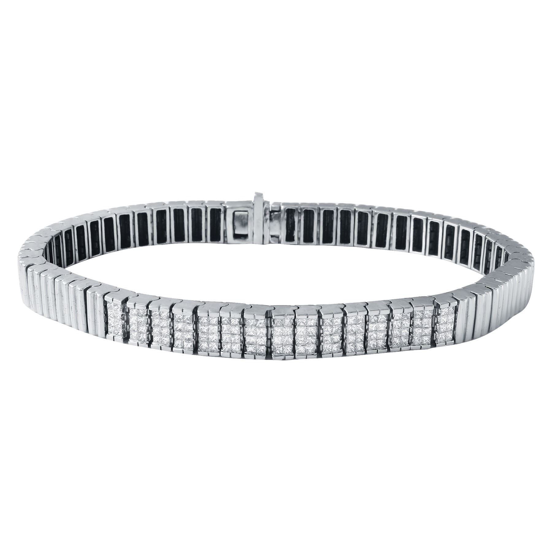14KT White Gold 2.03ctw Diamond Bracelet. (120) Princess cut Diamonds with a total weight of 2.03cts with a color of I and clarity of I-1. Total length of this bracelet is 9 inches. Total weight of this bracelet is 50.08 grams.