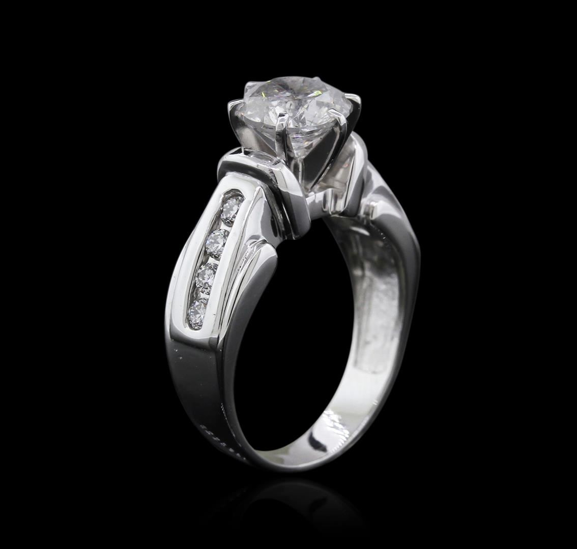 One electronically tested 14KT white gold ladies cast diamond engagement ring with a bright polish finish. Identified with markings of "14K". Condition is very good. Containing: One prong set round brilliant cut diamond, measuring 7.60 - 7.60 x 5.18mm (depth est.) approximate weight of 1.83ct. Clarity: I-3. Color: J, Cut is Good. Eight channel set round brilliant cut diamonds, measuring 1.90 - 1.90 x 1.14mm (depth est.) approximate. Total Weight of 8 Stones = 0.20ct. Clarity: SI-2 to I-1. Color: I - J, Cut is Very Good. All diamonds are graded in the mounting, unless otherwise stated. Total Weight of Diamonds 2.03ct. Total Weight of Engagement Ring 6.60 grams. GGL Appraised at $6,645.00.