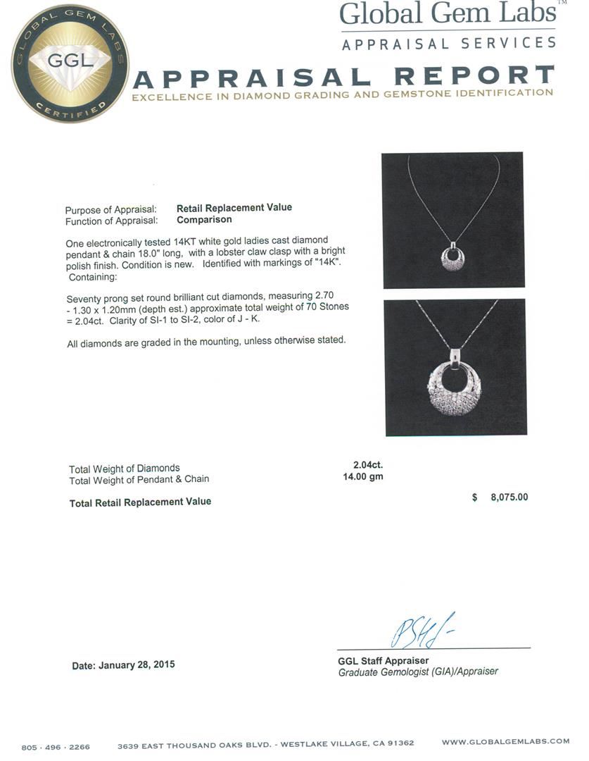 One electronically tested 14KT white gold ladies cast diamond pendant & chain 18.0" long, with a lobster claw clasp with a bright polish finish. Identified with markings of "14K". Condition is new. Containing: Seventy prong set round brilliant cut diamonds, measuring 2.70 - 1.30 x 1.20mm (depth est.) approximate total weight of 70 Stones = 2.04ct. Clarity: SI-1 to SI-2. Color: J - K. All diamonds are graded in the mounting, unless otherwise stated. Total Weight of Diamonds 2.04ct. Total Weight of Pendant & Chain 14.00 grams. GGL Appraised at $8,075.00.