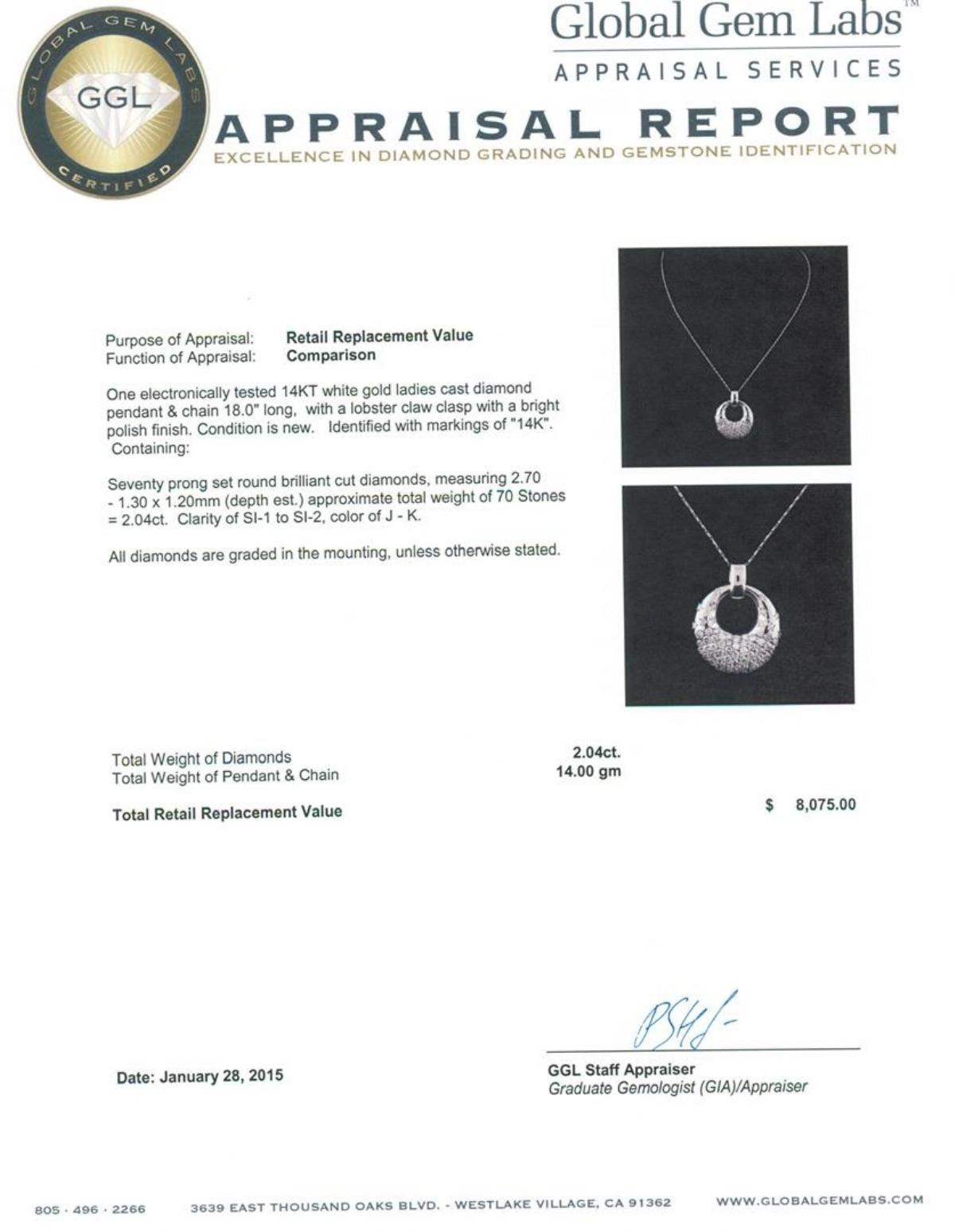 One electronically tested 14KT white gold ladies cast diamond pendant & chain 18.0" long, with a lobster claw clasp with a bright polish finish. Identified with markings of "14K". Condition is new. Containing: Seventy prong set round brilliant cut diamonds, measuring 2.70 - 1.30 x 1.20mm (depth est.) approximate total weight of 70 Stones = 2.04ct. Clarity: SI-1 to SI-2. Color: J - K. All diamonds are graded in the mounting, unless otherwise stated. Total Weight of Diamonds 2.04ct. Total Weight of Pendant & Chain 14.00 grams. GGL Appraised.