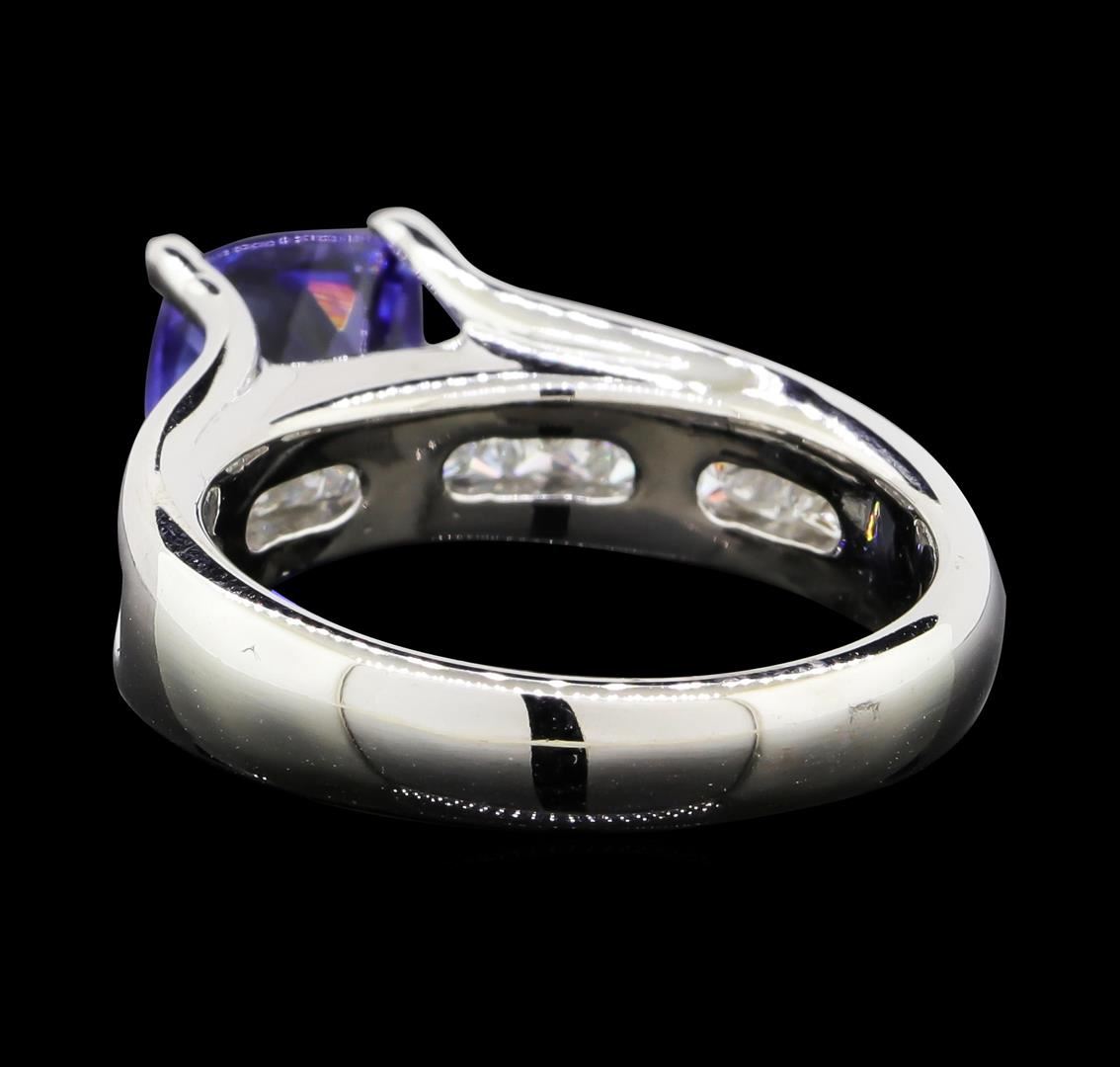 One electronically tested 14KT white gold lady's cast fashion ring with a cathedral channel with a bright polish finish. The featured lady's ring has a shank measuring 3.80 millimeters wide. Identified with markings of "14K". Condition is new, good workmanship. Containing: One prong set square cushion modified brilliant cut natural tanzanite, measuring 7.53 x 7.42 x 4.45mm, (depth est.) approximate weight of 2.04ct., clarity is slightly included, medium, moderately strong, bluish violet color, (GIA bV 5/4), cut is very good. Transmitting light with a minimum of distortion, transparent. Colored gemstones are presumed to have been subjected to commonly used enhancement processes. Graded in the setting.Eleven channel set princess cut diamonds, measuring 2.60 x 2.55 x 1.79mm (depth est.) approximate total weight of 11 Stones = 1.07ct. Graded in the setting. Clarity: VS-1 to VS-2. Color: H - ICut Very Good. Total Weight of Colored Stones 2.04ct. Total Weight of Diamonds 1.07ct. Total Weight of Ring 6.90gm. GAS Appraised.