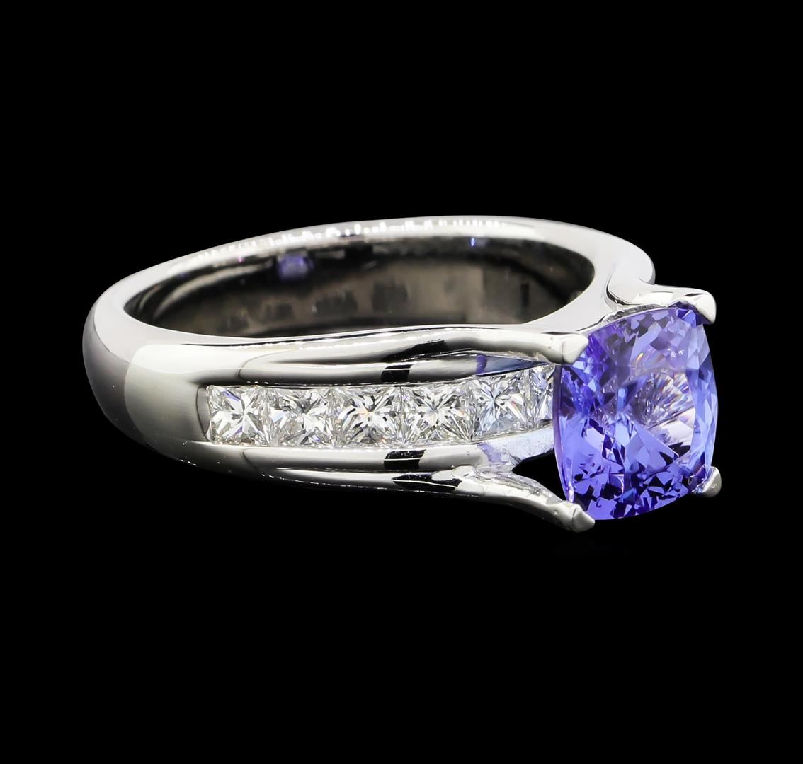 One electronically tested 14KT white gold lady's cast fashion ring with a cathedral channel with a bright polish finish. The featured lady's ring has a shank measuring 3.80 millimeters wide. Identified with markings of "14K". Condition is new, good workmanship. Containing: One prong set square cushion modified brilliant cut natural tanzanite, measuring 7.53 x 7.42 x 4.45mm, (depth est.) approximate weight of 2.04ct., clarity is slightly included, medium, moderately strong, bluish violet color, (GIA bV 5/4), cut is very good. Transmitting light with a minimum of distortion, transparent. Colored gemstones are presumed to have been subjected to commonly used enhancement processes. Graded in the setting.Eleven channel set princess cut diamonds, measuring 2.60 x 2.55 x 1.79mm (depth est.) approximate total weight of 11 Stones = 1.07ct. Graded in the setting. Clarity: VS-1 to VS-2. Color: H - ICut Very Good. Total Weight of Colored Stones 2.04ct. Total Weight of Diamonds 1.07ct. Total Weight of Ring 6.90gm. GAS Appraised.