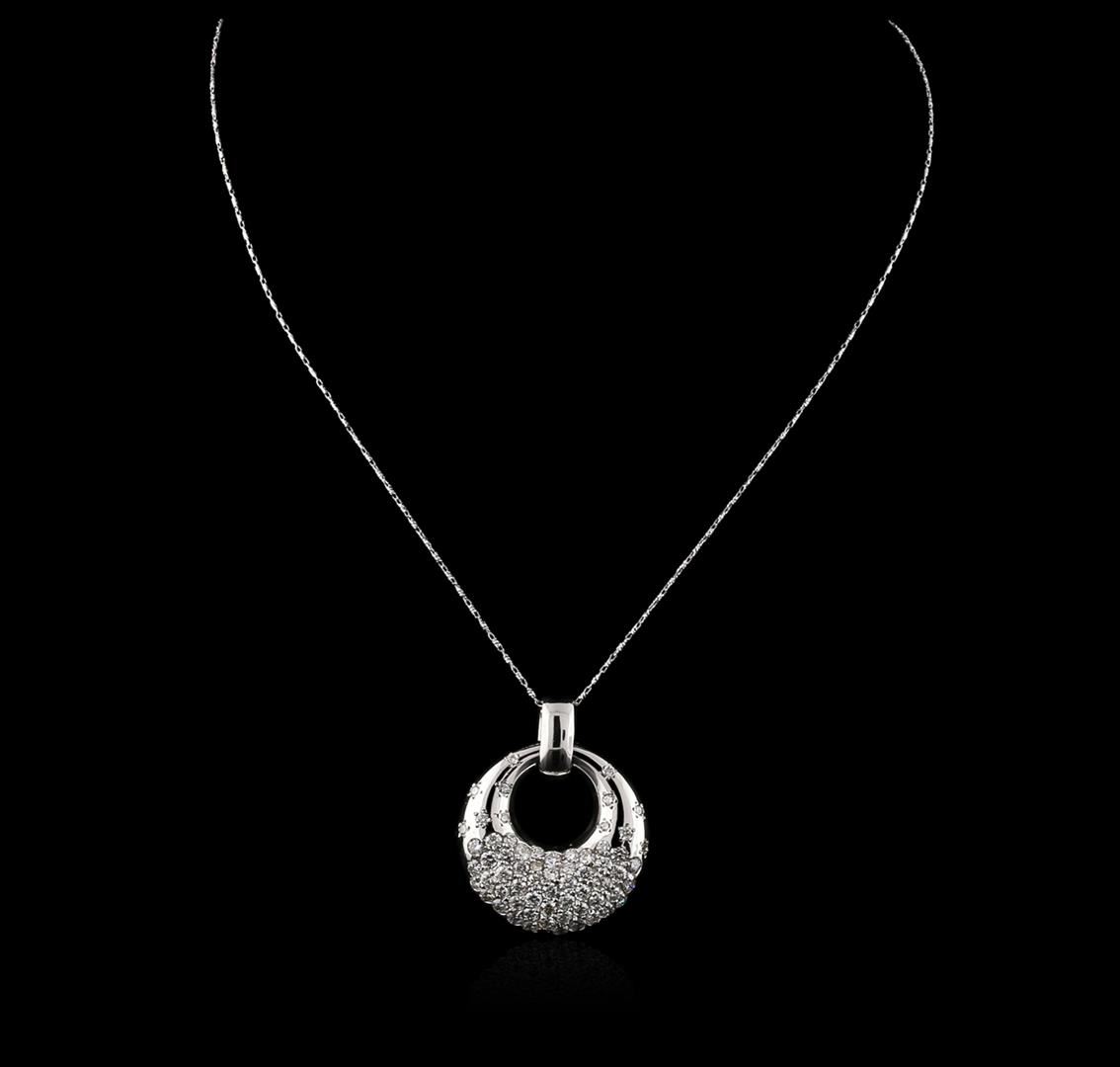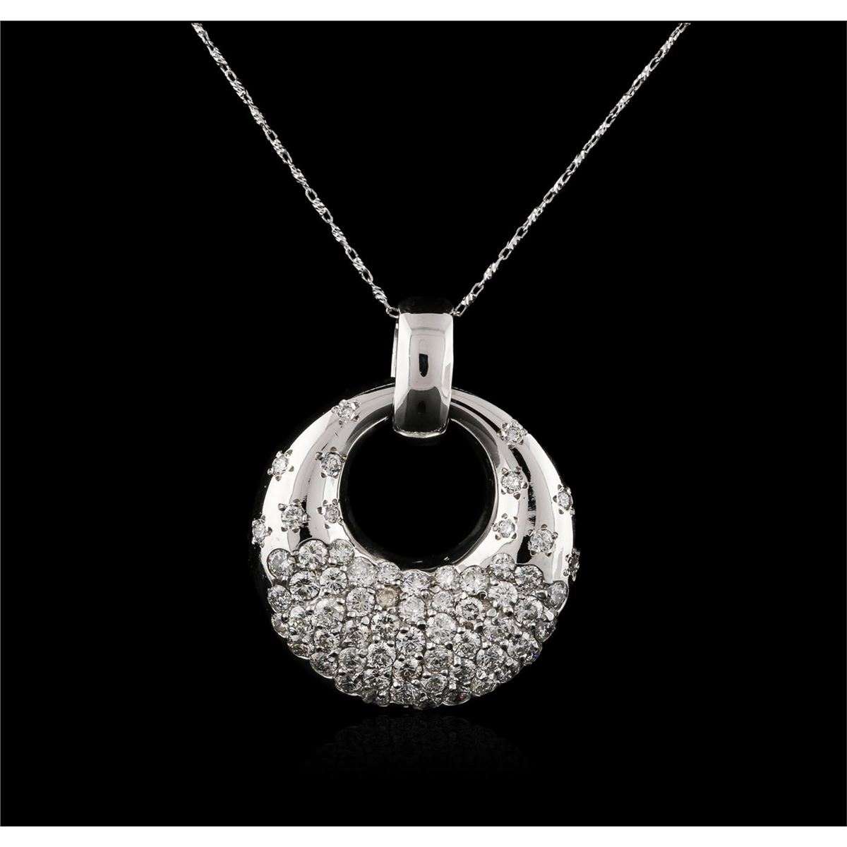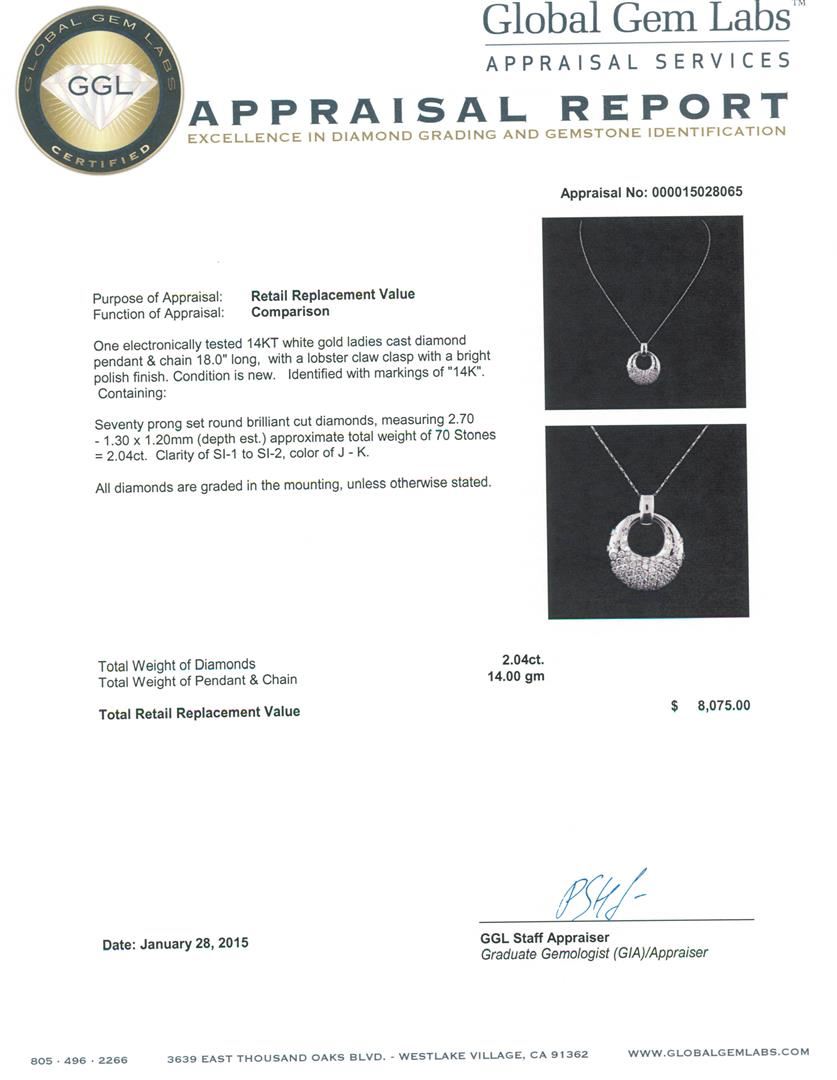 One electronically tested 14KT white gold ladies cast diamond pendant & chain 18.0" long, with a lobster claw clasp with a bright polish finish. Identified with markings of "14K". Condition is new. Containing: Seventy prong set round brilliant cut diamonds, measuring 2.70 - 1.30 x 1.20mm (depth est.) approximate total weight of 70 Stones = 2.04ct. Clarity: SI-1 to SI-2. Color: J - K. All diamonds are graded in the mounting, unless otherwise stated. Total Weight of Diamonds 2.04ct. Total Weight of Pendant & Chain 14.00 grams. GGL Appraised at $8,075.00.