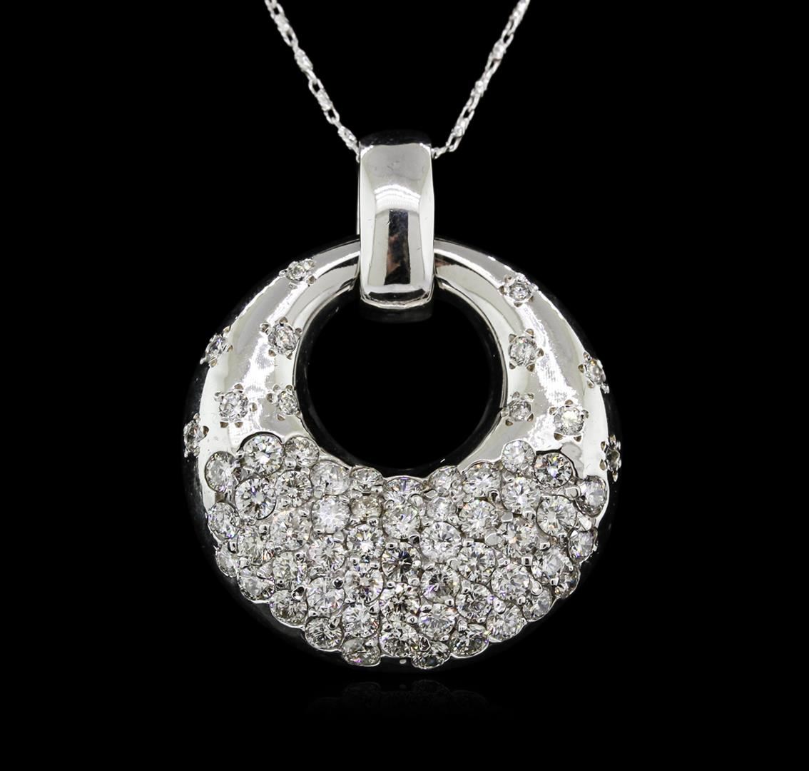 One electronically tested 14KT white gold ladies cast diamond pendant & chain 18.0" long, with a lobster claw clasp with a bright polish finish. Identified with markings of "14K". Condition is new. Containing: Seventy prong set round brilliant cut diamonds, measuring 2.70 - 1.30 x 1.20mm (depth est.) approximate total weight of 70 Stones = 2.04ct. Clarity: SI-1 to SI-2. Color: J - K. All diamonds are graded in the mounting, unless otherwise stated. Total Weight of Diamonds 2.04ct. Total Weight of Pendant & Chain 14.00 grams. GGL Appraised at $8,075.00.