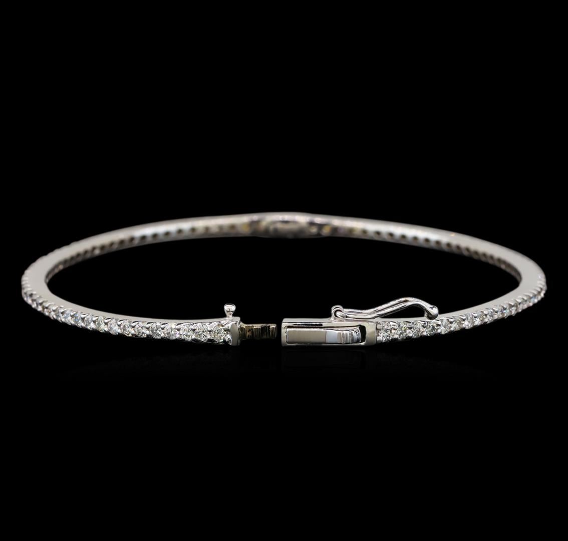 One electronically tested 14KT white gold ladies combination cast & assembled diamond bangle bracelet with a hidden box clasp with safety closer with a bright polish finish. The inside diameter of the bracelet is 2-1/4" wide Identified with markings of "K14". Condition is new. Containing: Ninety prong set round brilliant cut diamonds, measuring 1.80 - 1.80 x 1.08mm (depth est.) exact total weight 90 Stones = 2.05ct. Clarity: SI-1 to SI-2. Color: I - K, Cut is Good. All diamonds are graded in the mounting, unless otherwise stated. Total Weight of Diamonds 2.05ct. Total Weight of Bangle Bracelet 8.60 grams. GGL Appraised at $4,250.00.