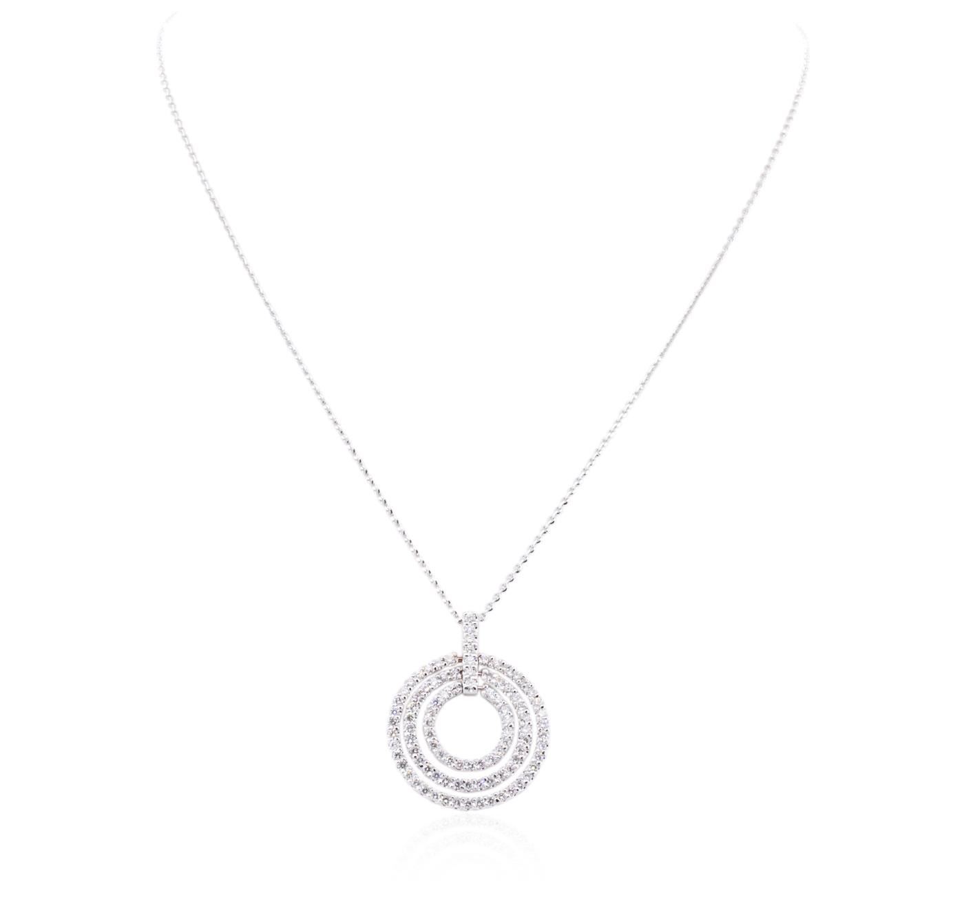 One electronically tested 14KT white gold ladies combination cast & assembled diamond pendant & chain 18.0" long, cable link with a lobster claw clasp with a bright polish finish. Identified with markings of "14K". Condition is new. Containing: Ninety-Six prong set round brilliant cut diamonds, measuring 1.80 - 1.80 x 1.08mm (depth est.) approximate total weight of 96 Stones = 2.05ct. Clarity: SI-2 to I-1. Color: J - K, Cut is Good. All diamonds are graded in the mounting, unless otherwise stated. Total Weight of Diamonds 2.05ct. Total Weight of Pendant & Chain 9.50 grams. GGL Appraised at $7,120.00.
