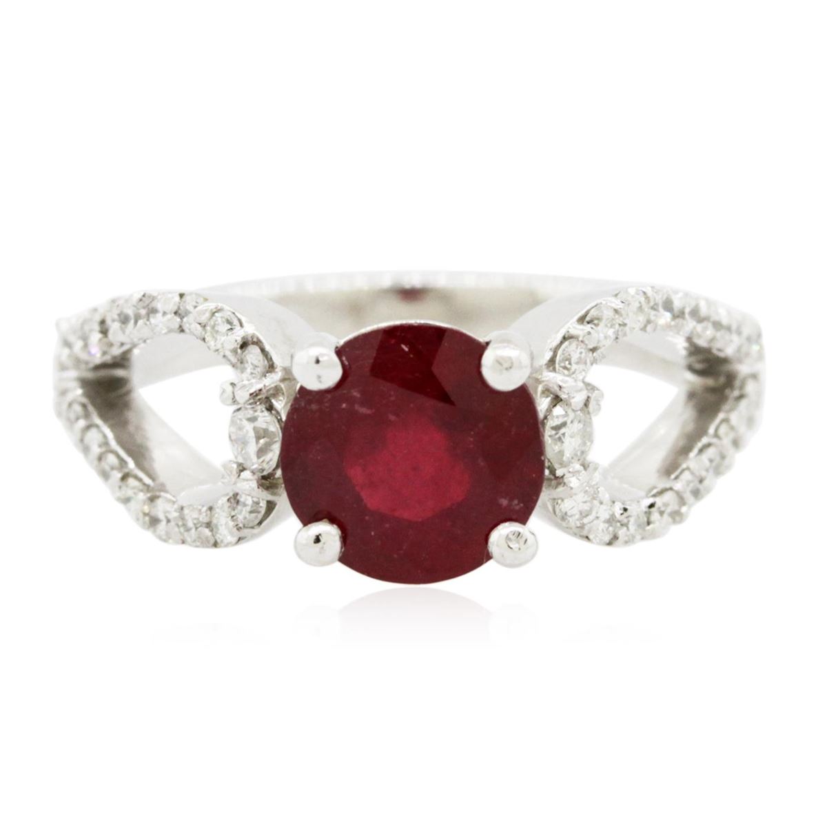 One electronically tested 14KT white gold ladies cast ruby and diamond ring with a bright polish finish. Identified with markings of "14K". Condition is new. Containing: One prong set round modified brilliant cut natural ruby, measuring 7.30 - 7.30 x 4.75 mm, approximate weight of 2.05ct., clarity is heavily included, medium, moderately strong, strongly purplish red color, (GIA stpR 5/4), cut is good. Thirty-Six prong set round brilliant cut diamonds, measuring 1.50 - 1.50 x 0.90mm (depth est.) approximate total weight of 36 Stones = 0.44ct. Clarity: SI-2 to I-1. Color: I - J, Cut is Good. Two prong set round brilliant cut diamonds, measuring 2.00 - 2.00 x 1.20mm (depth est.) approximate total weight of 2 Stones = 0.06ct. Clarity: SI-1. Color: H, Cut is Good. Colored gemstones are presumed to have been subjected to commonly used enhancement processes. All diamonds and colored gemstones are graded in the mounting, unless otherwise stated. Total Weight of Colored Stones 2.05ct. Total Weight of Diamonds 0.50ct. Total Weight of Ring 5.40 grams. GGL Appraised at $3,120.00.