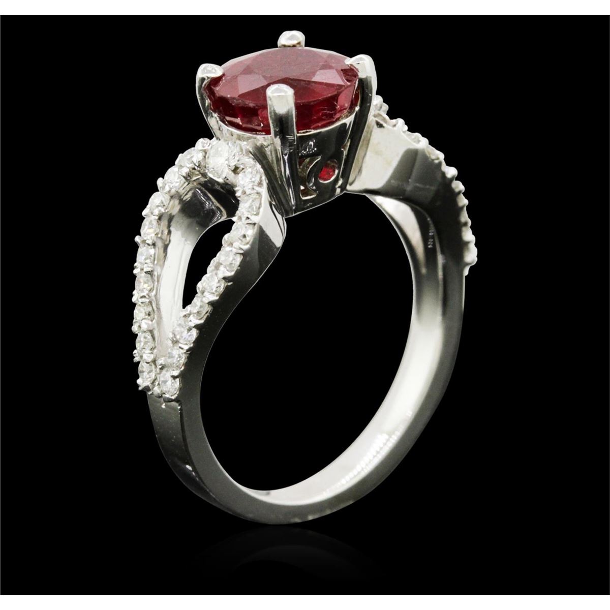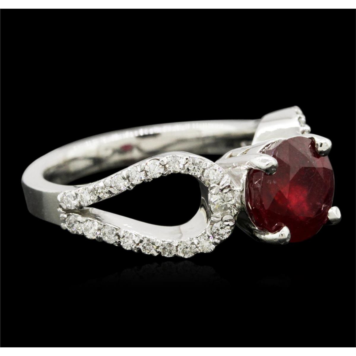One electronically tested 14KT white gold ladies cast ruby and diamond ring with a bright polish finish. Identified with markings of "14K". Condition is new. Containing: One prong set round modified brilliant cut natural ruby, measuring 7.30 - 7.30 x 4.75 mm, approximate weight of 2.05ct., clarity is heavily included, medium, moderately strong, strongly purplish red color, (GIA stpR 5/4), cut is good. Thirty-Six prong set round brilliant cut diamonds, measuring 1.50 - 1.50 x 0.90mm (depth est.) approximate total weight of 36 Stones = 0.44ct. Clarity: SI-2 to I-1. Color: I - J, Cut is Good. Two prong set round brilliant cut diamonds, measuring 2.00 - 2.00 x 1.20mm (depth est.) approximate total weight of 2 Stones = 0.06ct. Clarity: SI-1. Color: H, Cut is Good. Colored gemstones are presumed to have been subjected to commonly used enhancement processes. All diamonds and colored gemstones are graded in the mounting, unless otherwise stated. Total Weight of Colored Stones 2.05ct. Total Weight of Diamonds 0.50ct. Total Weight of Ring 5.40 grams. GGL Appraised at $3,120.00.