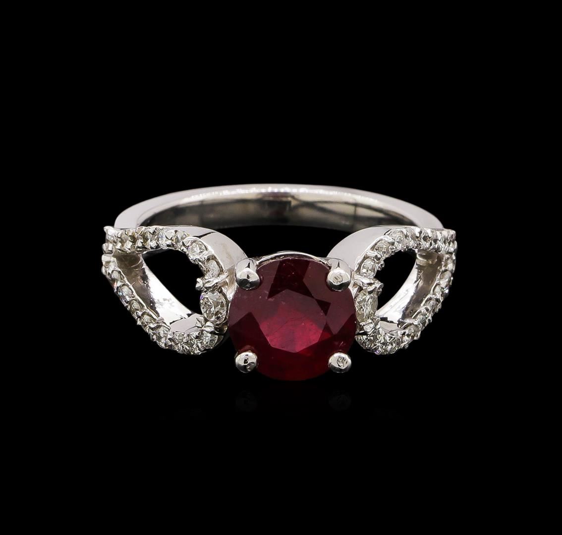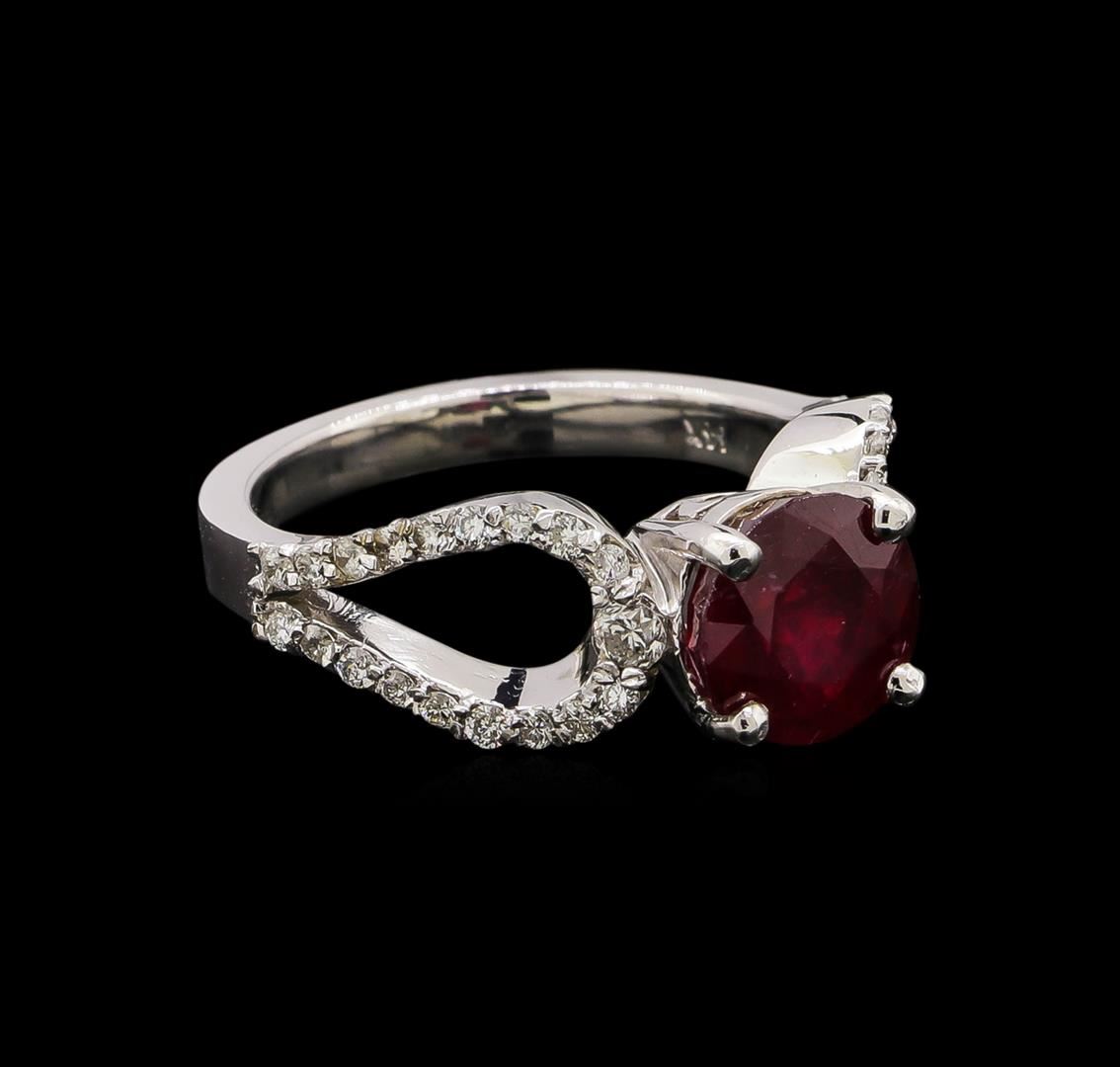 One electronically tested 14KT white gold ladies cast ruby and diamond ring with a bright polish finish. Identified with markings of "14K". Condition is new. Containing: One prong set round modified brilliant cut natural ruby, measuring 7.30 - 7.30 x 4.75 mm, approximate weight of 2.05ct., clarity is heavily included, medium, moderately strong, strongly purplish red color, (GIA stpR 5/4), cut is good. Thirty-Six prong set round brilliant cut diamonds, measuring 1.50 - 1.50 x 0.90mm (depth est.) approximate total weight of 36 Stones = 0.44ct. Clarity: SI-2 to I-1. Color: I - J, Cut is Good. Two prong set round brilliant cut diamonds, measuring 2.00 - 2.00 x 1.20mm (depth est.) approximate total weight of 2 Stones = 0.06ct. Clarity: SI-1. Color: H, Cut is Good. Colored gemstones are presumed to have been subjected to commonly used enhancement processes. All diamonds and colored gemstones are graded in the mounting, unless otherwise stated. Total Weight of Colored Stones 2.05ct. Total Weight of Diamonds 0.50ct. Total Weight of Ring 5.40 grams. GGL Appraised at $3,120.00.