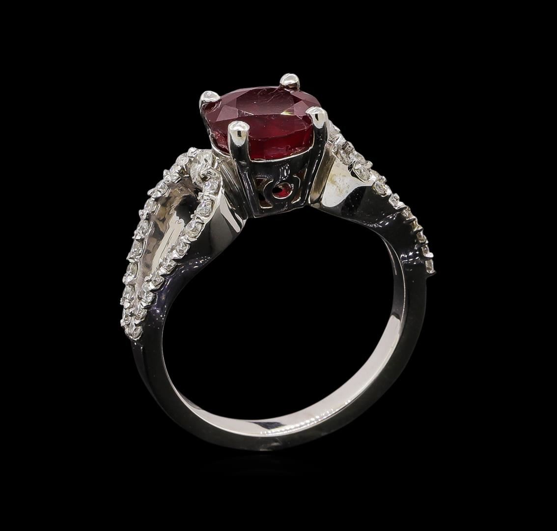 One electronically tested 14KT white gold ladies cast ruby and diamond ring with a bright polish finish. Identified with markings of "14K". Condition is new. Containing: One prong set round modified brilliant cut natural ruby, measuring 7.30 - 7.30 x 4.75 mm, approximate weight of 2.05ct., clarity is heavily included, medium, moderately strong, strongly purplish red color, (GIA stpR 5/4), cut is good. Thirty-Six prong set round brilliant cut diamonds, measuring 1.50 - 1.50 x 0.90mm (depth est.) approximate total weight of 36 Stones = 0.44ct. Clarity: SI-2 to I-1. Color: I - J, Cut is Good. Two prong set round brilliant cut diamonds, measuring 2.00 - 2.00 x 1.20mm (depth est.) approximate total weight of 2 Stones = 0.06ct. Clarity: SI-1. Color: H, Cut is Good. Colored gemstones are presumed to have been subjected to commonly used enhancement processes. All diamonds and colored gemstones are graded in the mounting, unless otherwise stated. Total Weight of Colored Stones 2.05ct. Total Weight of Diamonds 0.50ct. Total Weight of Ring 5.40 grams. GGL Appraised at $3,120.00.