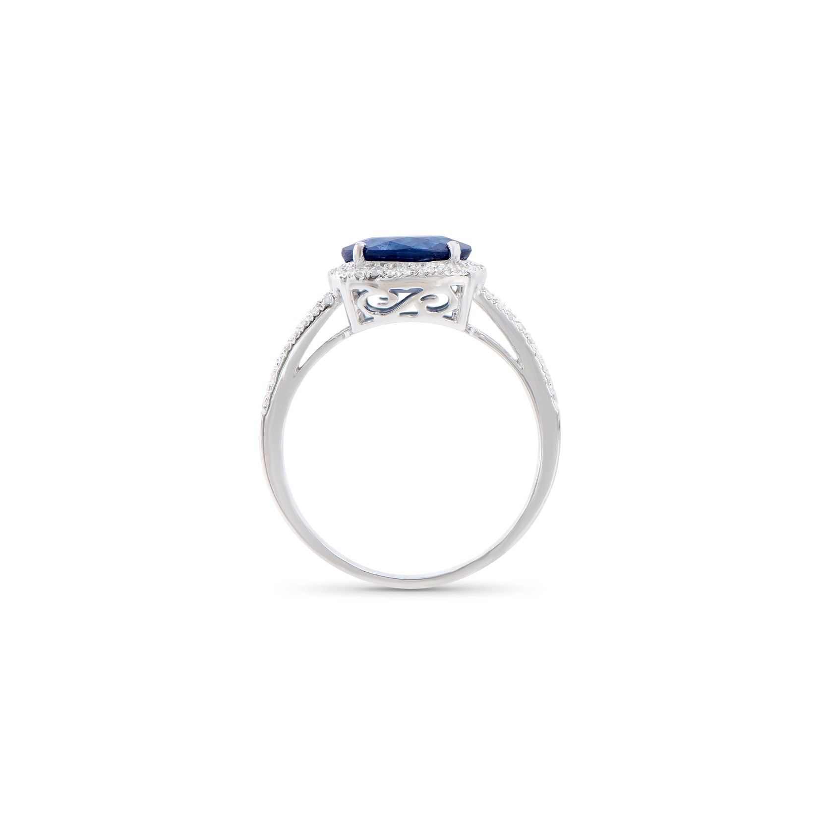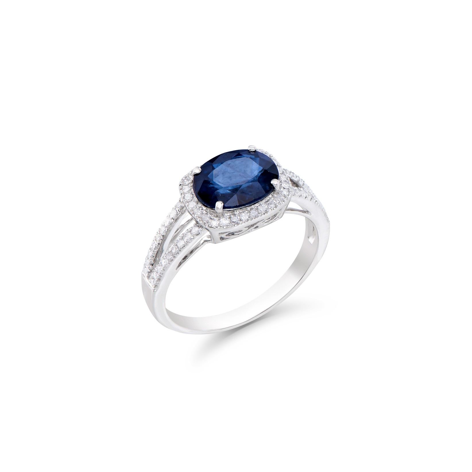 (1) Blue Sapphire with a total weight of 2.05cts. (64) round Diamonds with a total weight of 0.27cts with a color of H-I and clarity of I1-I2. Total weight of this ring is 2.60 grams. Ring size is 7.5.