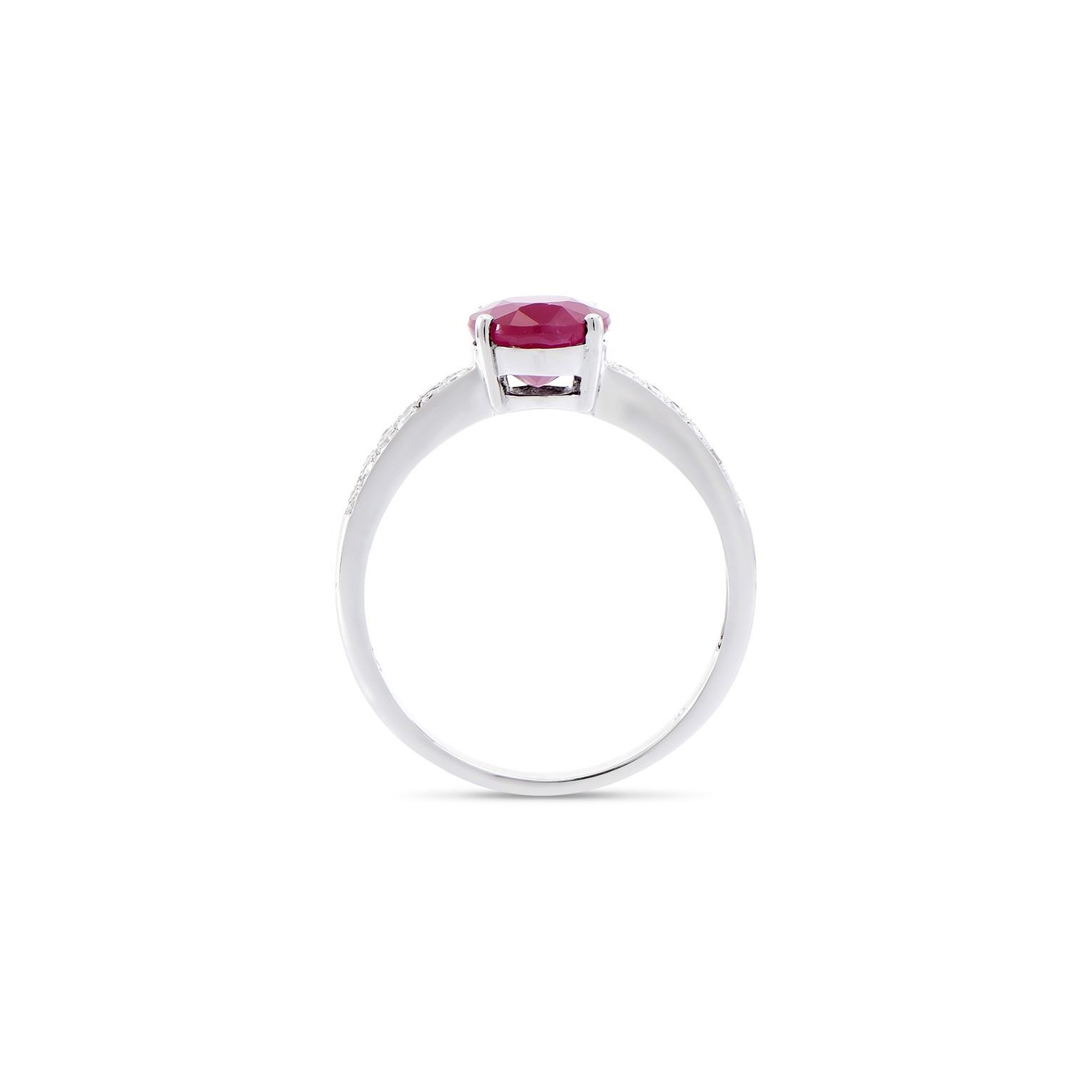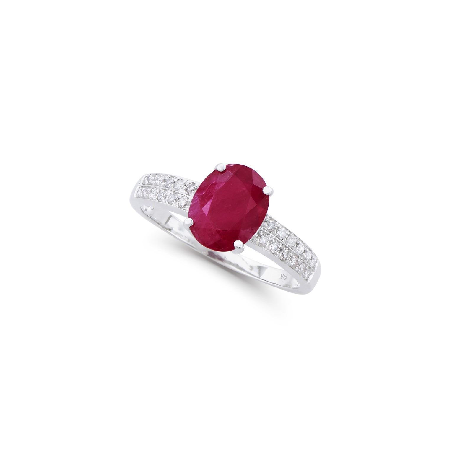 (1) Ruby with a total weight of 2.05cts. (24) round Diamonds with a total weight of 0.20cts with a color of H-I and clarity of I1-I2. Total weight of the ring is 2.10 grams. Ring size 7.5.