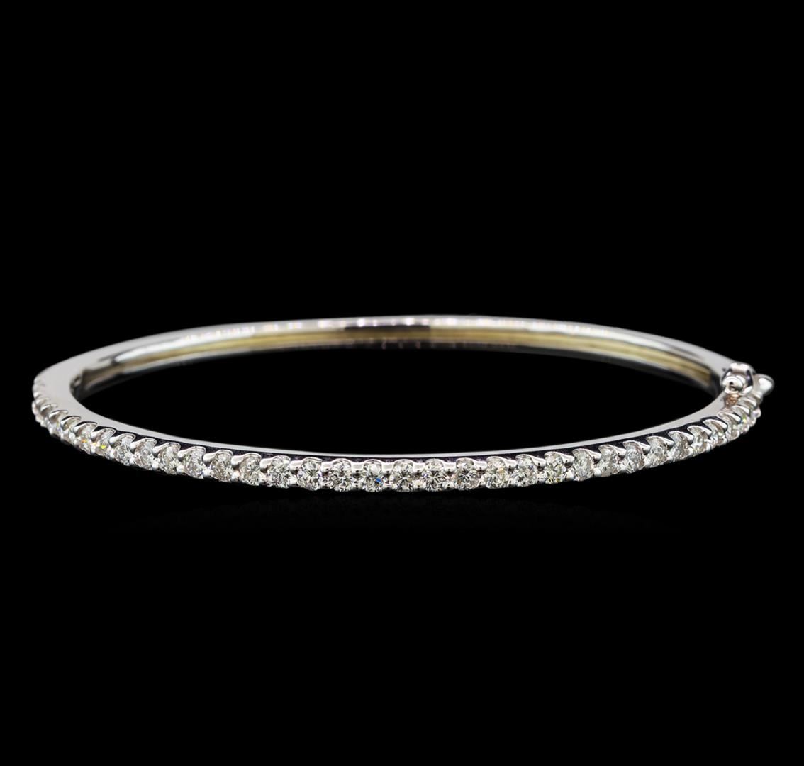 One electronically tested 14KT white gold ladies cast diamond bangle bracelet with a hidden box clasp with safety closer with a bright polish finish. Condition is new. Containing: Thirty-Six prong set round brilliant cut diamonds, measuring 2.50 - 2.50 x 1.50mm (depth est.) approximate total weight of 36 Stones = 2.06ct. Clarity: SI-1 to I-1. Color: H - J, Cut is Good. All diamonds are graded in the mounting, unless otherwise stated. Total Weight of Diamonds 2.06ct. Total Weight of Bangle Bracelet 12.50 grams. GGL Appraised at $6,465.00.