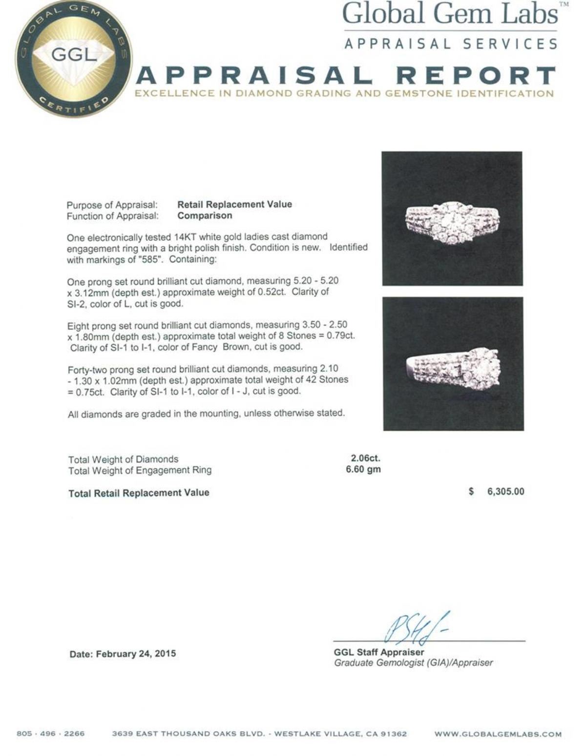 One electronically tested 14KT white gold ladies cast diamond engagement ring with a bright polish finish. Identified with markings of "585". Condition is new. Containing: One prong set round brilliant cut diamond, measuring 5.20 - 5.20 x 3.12mm (depth est.) approximate weight of 0.52ct. Clarity: SI-2. Color: L, Cut is Good. Eight prong set round brilliant cut diamonds, measuring 3.50 - 2.50 x 1.80mm (depth est.) approximate total weight of 8 Stones = 0.79ct. Clarity: SI-1 to I-1, Cut is Good. Forty-Two prong set round brilliant cut diamonds, measuring 2.10 - 1.30 x 1.02mm (depth est.) approximate total weight of 42 Stones = 0.75ct. Clarity: SI-1 to I-1. Color: I - J, Cut is Good. All diamonds are graded in the mounting, unless otherwise stated. Total Weight of Diamonds 2.06ct. Total Weight of Engagement Ring 6.60 grams. GGL Appraised.