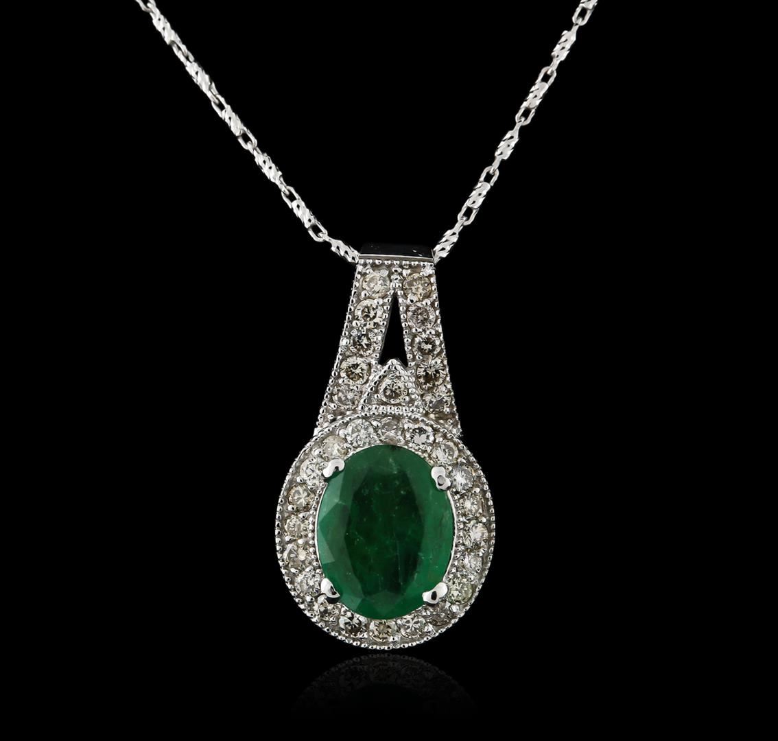 One electronically tested 14KT white gold ladies cast emerald and diamond pendant & chain 18.0" long, thin diamond cut link with a lobster claw clasp with a bright polish finish. Identified with markings of "K14". Condition is new. Containing: One prong set oval modified brilliant cut natural emerald, measuring 11.14 x 8.57 x 3.78mm, approximate weight of 2.06ct., clarity is heavily included, type III, light, very slightly grayish, green color, (GIA G 3/3), cut is good. Thirty-One prong set round brilliant cut diamonds, measuring 1.60 - 1.60 x 0.96mm (depth est.) approximate total weight of 31 Stones = 0.46ct. Clarity: SI-1 to SI-2. Color: L - M, Cut is Good. Diamonds and colored gemstones are graded in the mounting, unless otherwise stated. Colored gemstones are presumed to have been subjected to commonly used enhancement processes. Total Weight of Colored Stones 2.06ct. Total Weight of Diamonds 0.46ct. Total Weight of Pendant & Chain 7.30 grams. GGL Appraised at $3,180.00.