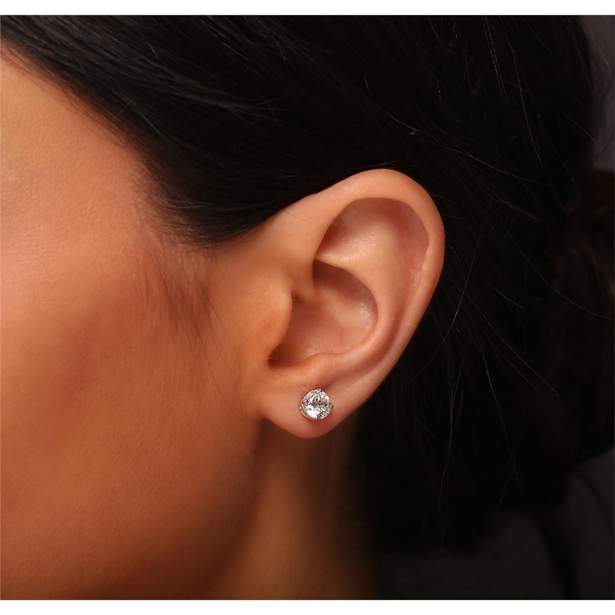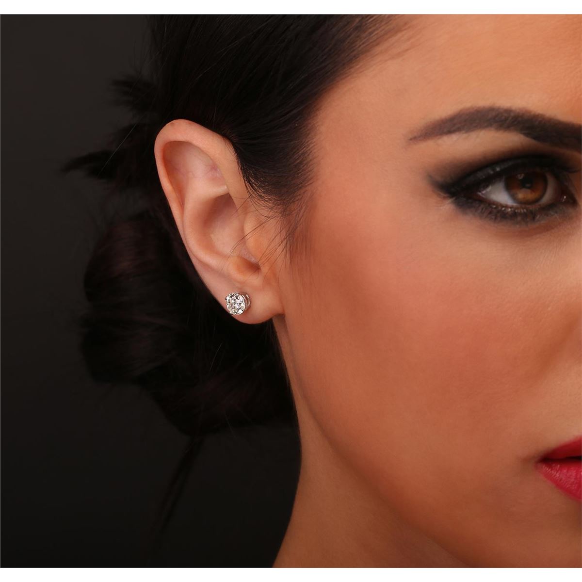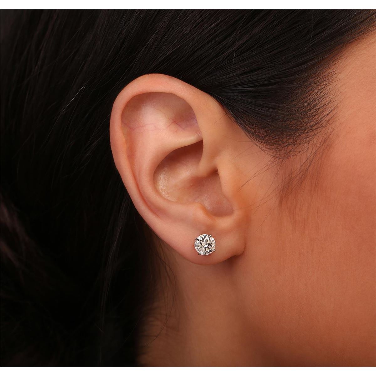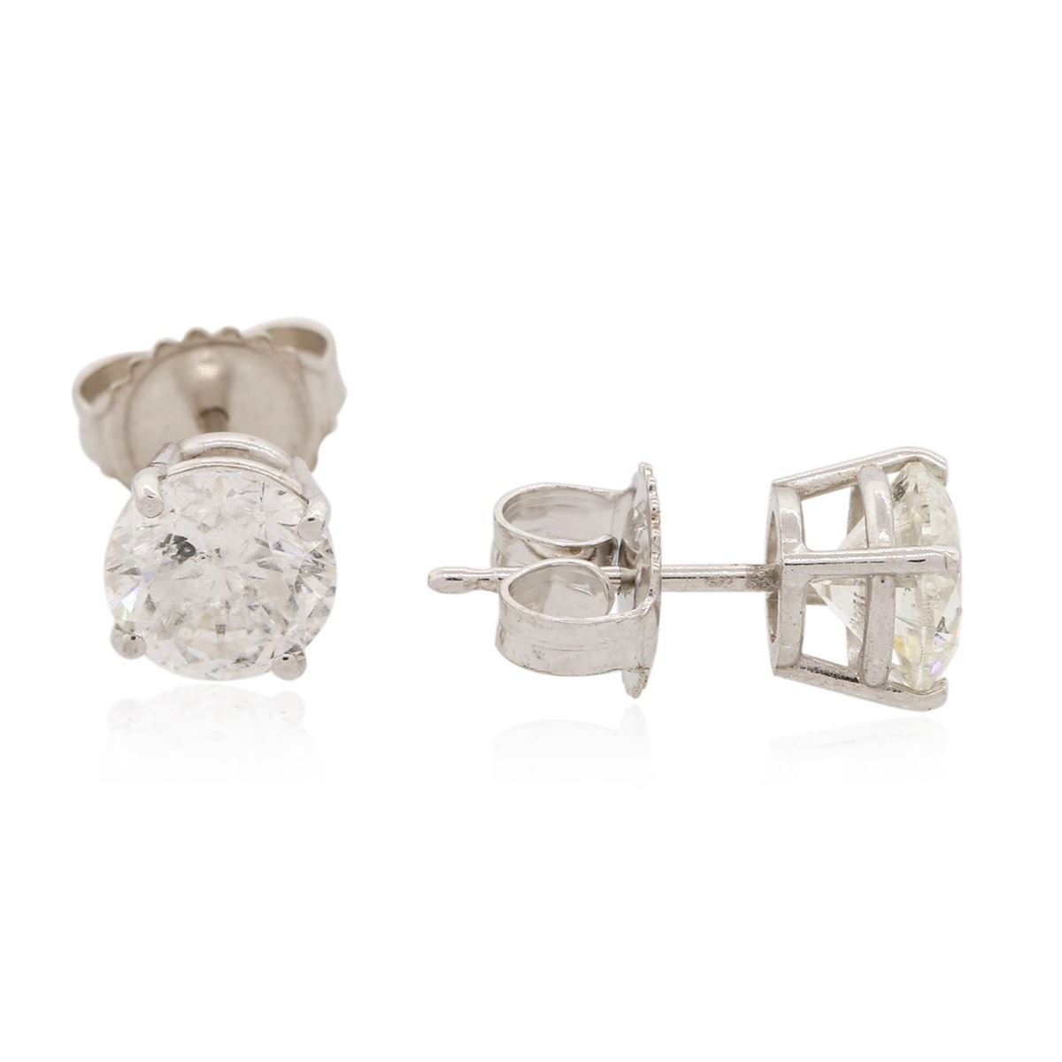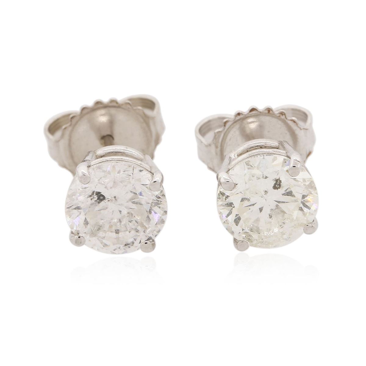 One pair electronically tested 14KT white gold Ladies combination cast & assembled stud earrings with friction posts with a bright polish finish. Condition is new. Identified with markings of "14K". Containing: One prong set round brilliant cut diamond, measuring 6.38 - 6.30 x 4.27mm (depth est.) approximate weight of 1.05ct. Clarity: I-2. Color: G, Cut is Good. One prong set round brilliant cut diamond, measuring 6.30 - 6.30 x 4.24mm (depth est.) approximate weight of 1.03ct. Clarity: I-2. Color: J, Cut is Good. Diamonds graded in the mounting. Total Weight of Diamonds 2.07ct. Total Weight of Earrings 1.50 grams. GGL Appraised at $12,055.00.