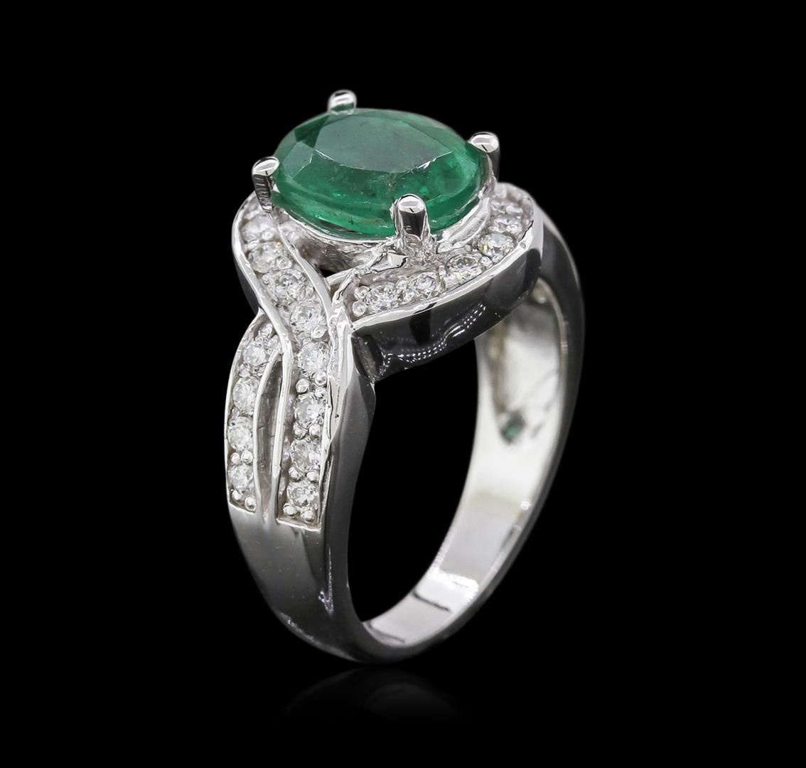 One electronically tested 14KT white gold ladies cast emerald and diamond ring with a bright polish finish. Condition is new. Containing: One prong set oval modified brilliant cut natural emerald, measuring 9.20 x 7.10 x 4.62mm, approximate weight of 2.07ct., clarity is moderately included, type III, medium, moderately strong, green color, (GIA G 5/4), cut is good. Thirty-Two prong set round brilliant cut diamonds, measuring 1.90 - 1.90 x 1.14mm (depth est.) approximate total weight of 32 Stones = 0.62ct. Clarity: SI-1 to SI-2. Color: I - J, Cut is Good. Colored gemstones are presumed to have been subjected to commonly used enhancement processes. All diamonds and colored gemstones are graded in the mounting, unless otherwise stated. Total Weight of Colored Stones 2.07ct. Total Weight of Diamonds 0.62ct. Total Weight of Ring 6.50 grams. GGL Appraised at $3,190.00.