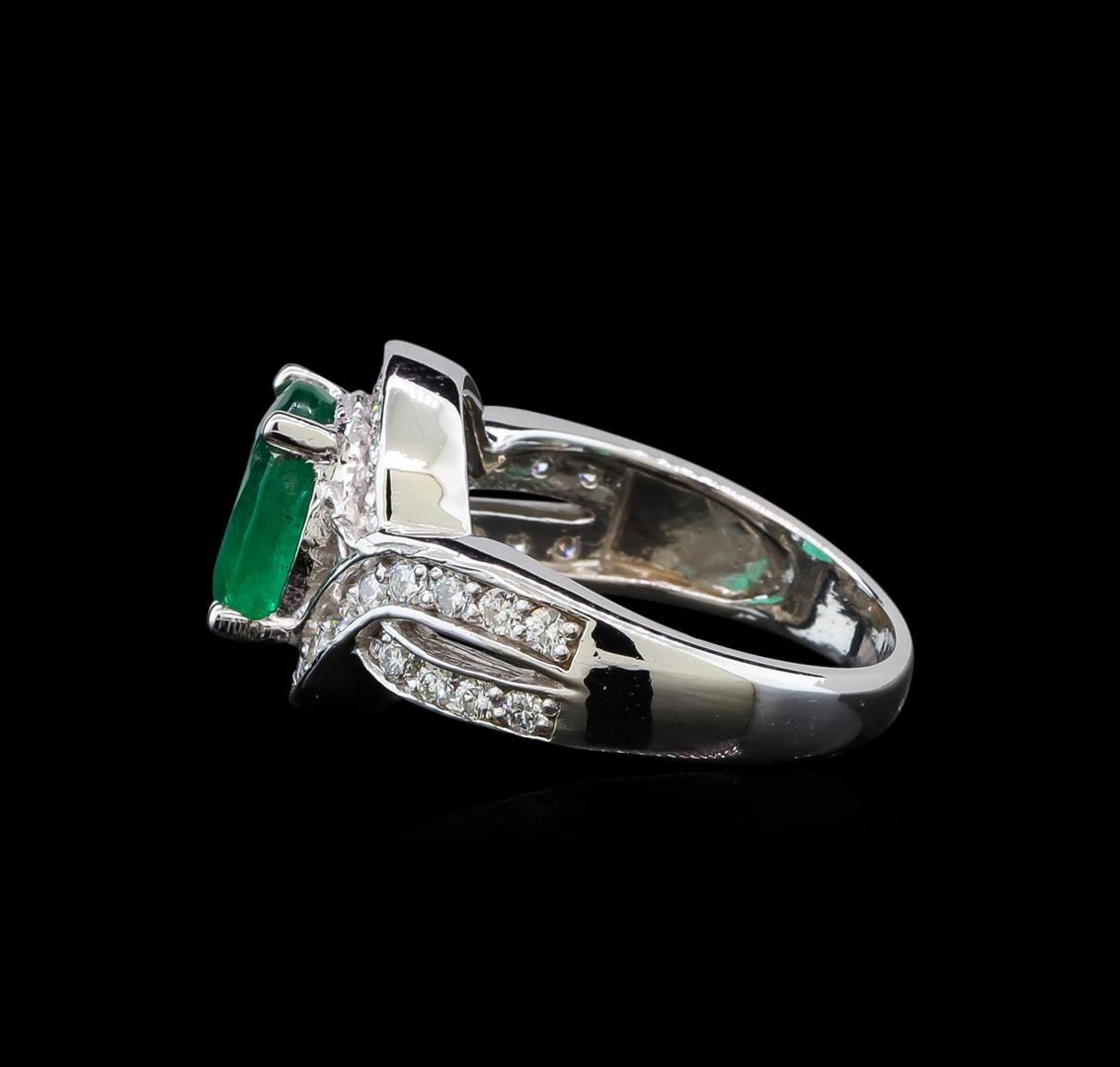 One electronically tested 14KT white gold ladies cast emerald and diamond ring with a bright polish finish. Condition is new. Containing: One prong set oval modified brilliant cut natural emerald, measuring 9.20 x 7.10 x 4.62mm, approximate weight of 2.07ct., clarity is moderately included, type III, medium, moderately strong, green color, (GIA G 5/4), cut is good. Thirty-Two prong set round brilliant cut diamonds, measuring 1.90 - 1.90 x 1.14mm (depth est.) approximate total weight of 32 Stones = 0.62ct. Clarity: SI-1 to SI-2. Color: I - J, Cut is Good. Colored gemstones are presumed to have been subjected to commonly used enhancement processes. All diamonds and colored gemstones are graded in the mounting, unless otherwise stated. Total Weight of Colored Stones 2.07ct. Total Weight of Diamonds 0.62ct. Total Weight of Ring 6.50 grams. GGL Appraised at $3,190.00.
