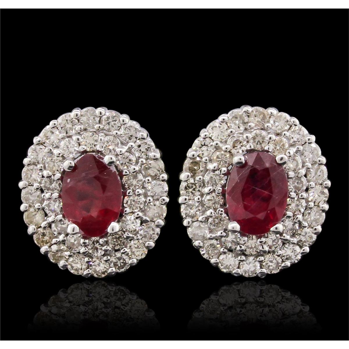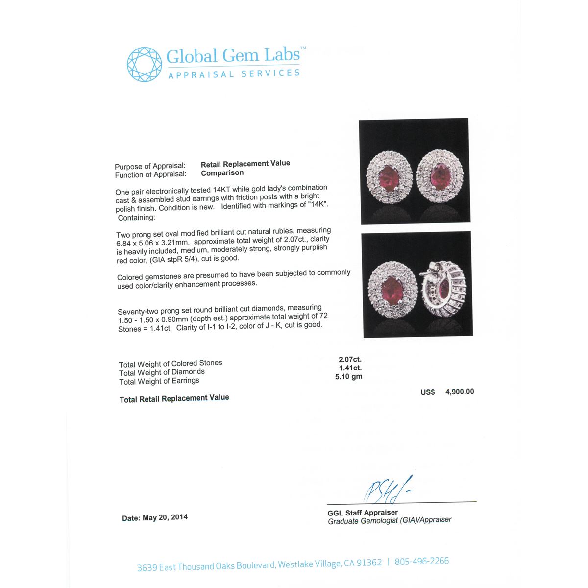 One pair electronically tested 14KT white gold Ladies combination cast & assembled stud earrings with friction posts with a bright polish finish. Condition is new. Identified with markings of "14K". Containing: Two prong set oval modified brilliant cut natural rubies, measuring 6.84 x 5.06 x 3.21mm, approximate. Total Weight of 2.07ct., clarity is heavily included, medium, moderately strong, strongly purplish red color, (GIA stpR 5/4), cut is good. Colored gemstones are presumed to have been subjected to commonly used color/clarity enhancement processes. Seventy-Two prong set round brilliant cut diamonds, measuring 1.50 - 1.50 x 0.90mm (depth est.) approximate. Total Weight of 72 Stones = 1.41ct. Clarity: I-1 to I-2. Color: J - K, Cut is Good. Total Weight of Colored Stones 2.07ct. Total Weight of Diamonds 1.41ct. Total Weight of Earrings 5.10 grams. GGL Appraised at $4,900.00.