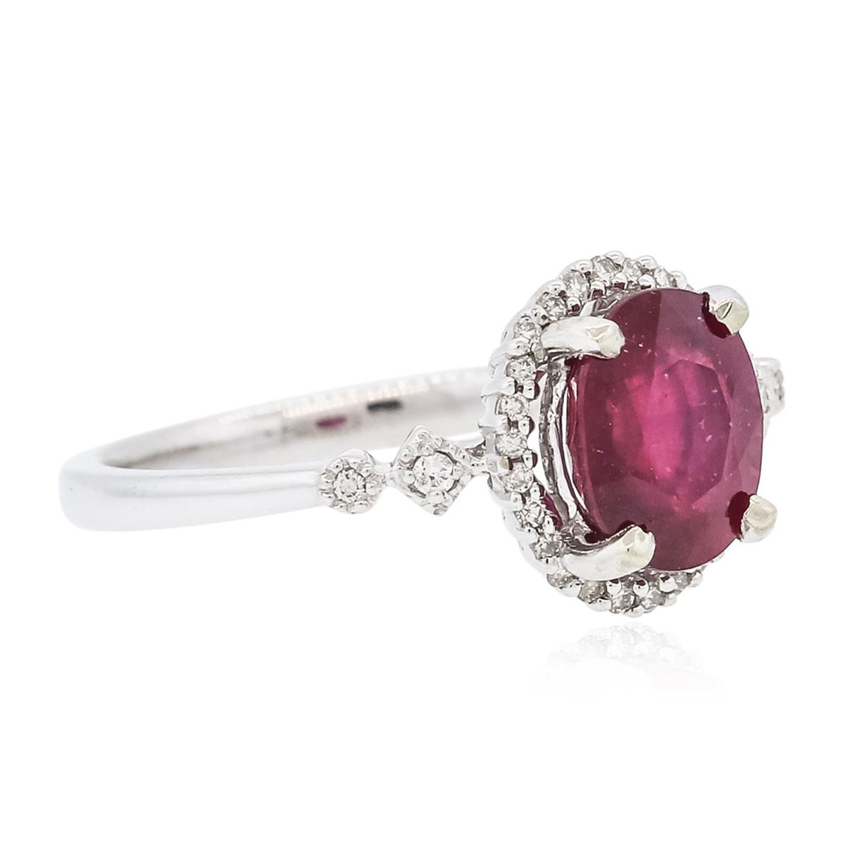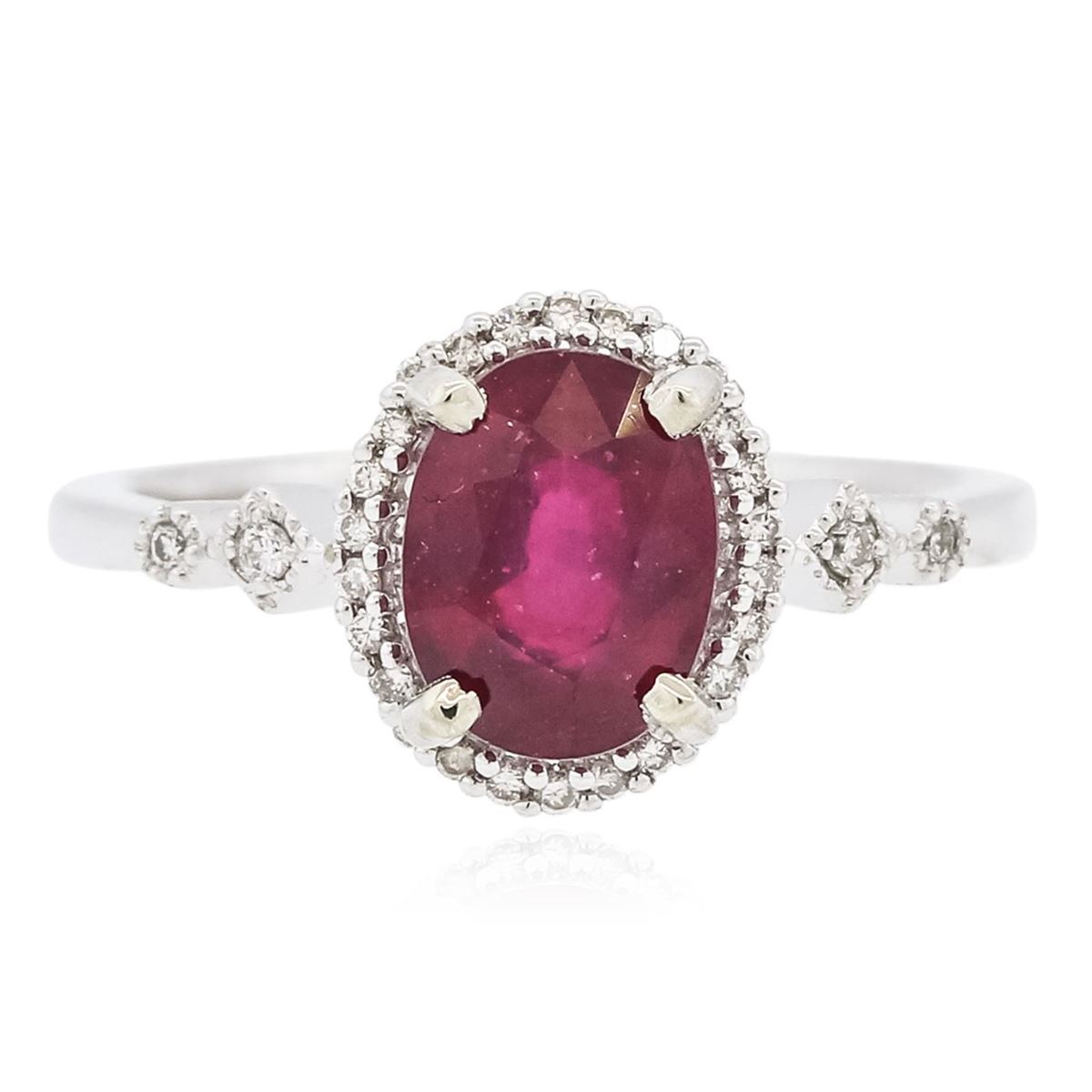 One electronically tested 14KT white gold ladies cast ruby and diamond ring. The featured ruby is set within a diamond bezel supported by diamond accented shoulders, completed by a two millimeter wide band. Bright polish finish with milgrain detailing. Trademark is PMI. Identified with markings of "14K". Condition is new, good workmanship. Containing: One prong set oval mixed cut natural ruby, measuring 8.10 x 6.25 x 4.65mm, 8%. bulge factor, approximate weight of 2.07ct., clarity is heavily included, type II, medium dark, very slightly brownish, red color, (GIA R 6/3), cut is good. Transmitting light somewhat diffusely, transparent to translucent. Naturally occurring internal & external characteristics are present. Indications of laboratory high temperature heat treatment, with glass & flux additives. Graded in the setting. Ruby has a low tolerance to rhodium plating, repolishing the surface, & ultrasonic cleaning. Thirty prong set round brilliant cut diamonds, measuring 1.30 - 1.10 x 0.72mm (depth est.) approximate total weight of 30 Stones = 0.29ct. Graded in the setting. Clarity: SI-1 to I-1. Color: H - J. Total Weight of Colored Stones 2.07ct. Total Weight of Diamonds 0.29ct. Total Weight of Ring 3.18 grams. AIG Appraised at $1,985.00.
