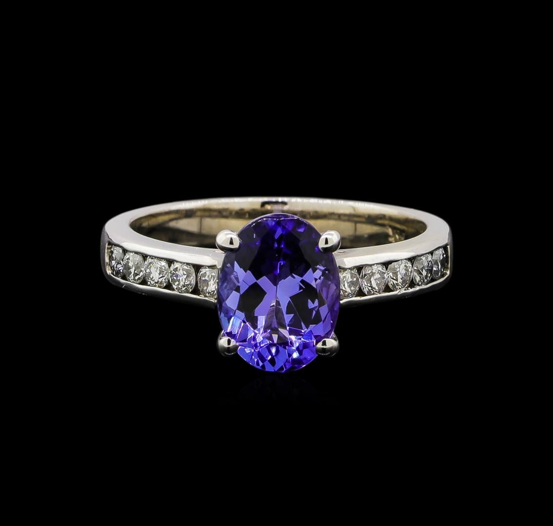 One electronically tested 14KT white gold ladies cast tanzanite and diamond ring. Identified with markings of "14K". Condition is new. Containing: One prong set oval modified brilliant cut natural tanzanite, measuring 9.00 x 7.00 x 4.55mm, approximate weight of 2.07ct., clarity is eye clean, type I, medium light, very slightly grayish, violet color, (GIA V 4/3), cut is good. Ten channel set round brilliant cut diamonds, measuring 2.00 - 2.00 x 1.20mm (depth est.) approximate total weight of 10 Stones = 0.32ct. Clarity: SI-1 to SI-2. Color: I - J, Cut is Good. Colored gemstones are presumed to have been subjected to commonly used enhancement processes. All diamonds and colored gemstones are graded in the mounting, unless otherwise stated. Total Weight of Colored Stones 2.07ct. Total Weight of Diamonds 0.32ct. Total Weight of Ring 3.70 grams. GGL Appraised at $2,200.00.