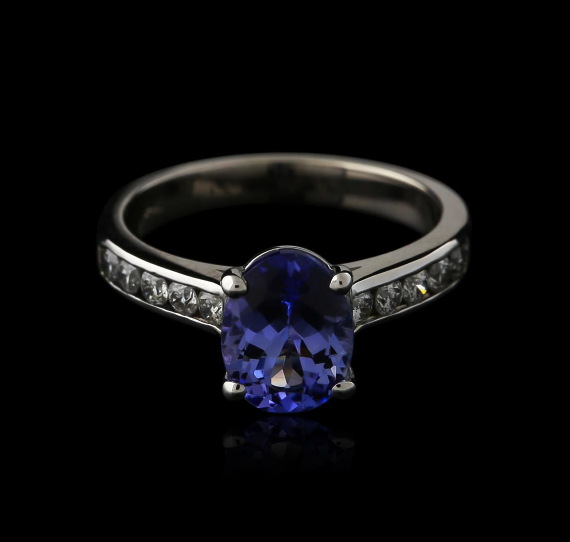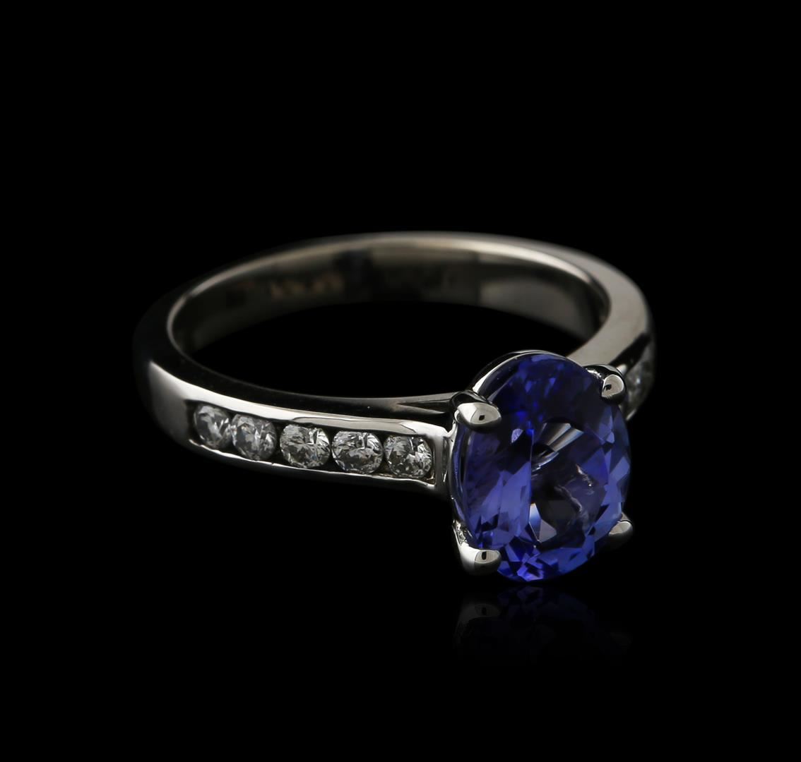 One electronically tested 14KT white gold ladies cast tanzanite and diamond ring. Identified with markings of "14K". Condition is new. Containing: One prong set oval modified brilliant cut natural tanzanite, measuring 9.00 x 7.00 x 4.55mm, approximate weight of 2.07ct., clarity is eye clean, type I, medium light, very slightly grayish, violet color, (GIA V 4/3), cut is good. Ten channel set round brilliant cut diamonds, measuring 2.00 - 2.00 x 1.20mm (depth est.) approximate total weight of 10 Stones = 0.32ct. Clarity: SI-1 to SI-2. Color: I - J, Cut is Good. Colored gemstones are presumed to have been subjected to commonly used enhancement processes. All diamonds and colored gemstones are graded in the mounting, unless otherwise stated. Total Weight of Colored Stones 2.07ct. Total Weight of Diamonds 0.32ct. Total Weight of Ring 3.70 grams. GGL Appraised at $2,200.00.