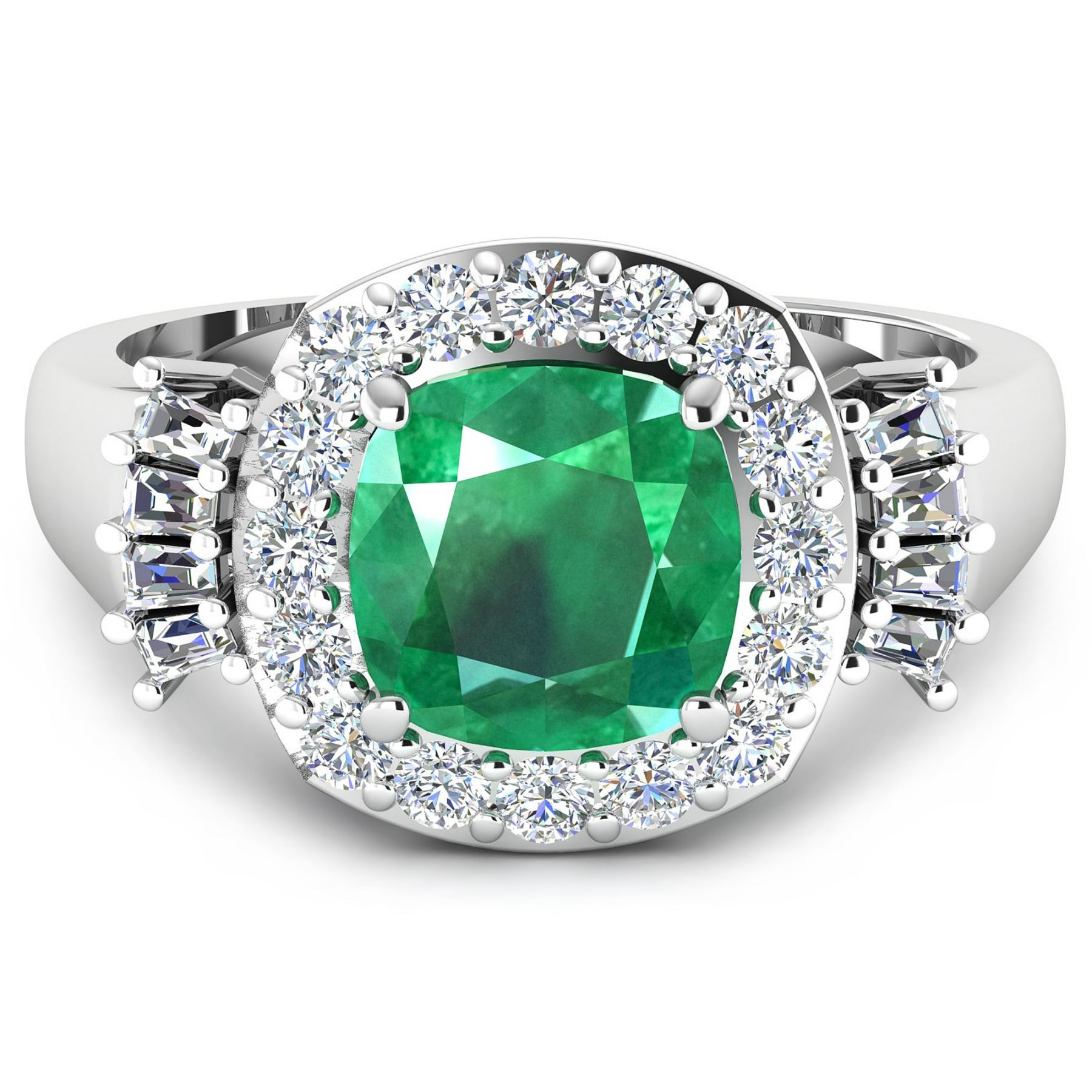 Zambian Emerald (AA) Cushion 8.00mm - 1Pc + White Diamond Tapper Baguette 2.00x1.50x1.10mm - 8Pcs + White Diamond F/C Round 2.00mm - 16Pcs ( Diamond Quality : SI-2/HI ). Total weight of gemstone is 2.07cts. Total weight of Diamonds is 0.73cts. Total weight of this ring is 4.59 grams. Ring size 7.