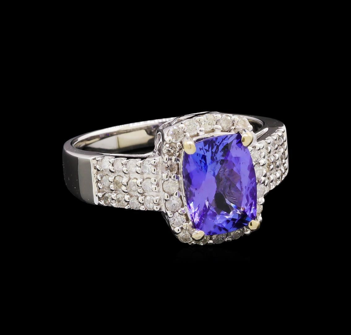 One electronically tested 14KT white gold ladies combination cast & assembled tanzanite and diamond ring with a flat shank with a bright polish finish. Identified with markings of "14K". Condition is new. Containing: One prong set rectangular cushion modified brilliant cut natural tanzanite, measuring 9.00 x 6.85 x 4.28mm, approximate weight of 2.08ct., clarity is eye clean, type I, medium light, moderately strong, violet color, (GIA V 4/4), cut is good. Twenty-Three prong set round brilliant cut diamonds, measuring 1.50 - 1.50 x 0.90mm (depth est.) approximate total weight of 23 Stones = 0.28ct. Clarity: I-1 to I-3. Color: I - J, Cut is Good. Colored gemstones are presumed to have been subjected to commonly used enhancement processes. All diamonds and colored gemstones are graded in the mounting, unless otherwise stated. Total Weight of Colored Stones 2.08ct. Total Weight of Diamonds 0.28ct. Total Weight of Ring 5.20 grams. GGL Appraised at $5,400.00.