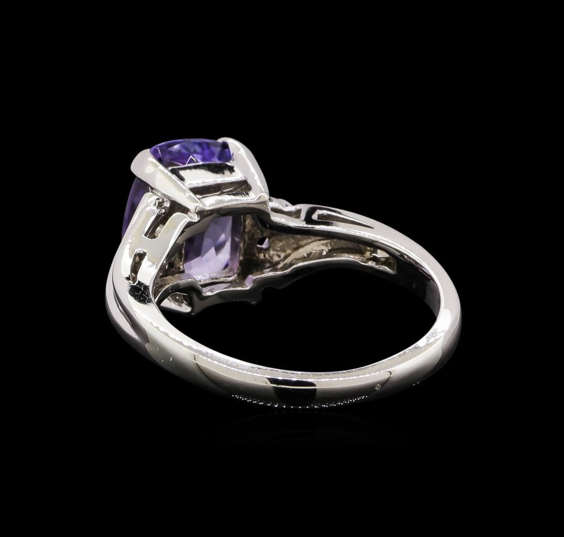 One electronically tested 14KT white gold ladies cast tanzanite and diamond ring with a bright polish finish. Identified with markings of "14K". Condition is new. Containing: One prong set rectangular cushion modified brilliant cut natural tanzanite, measuring 9.00 x 7.00 x 4.20mm, approximate weight of 2.08ct., clarity is eye clean, type I, medium, very slightly grayish, violet color, (GIA V 5/3), cut is good. Two prong set round brilliant cut diamonds, measuring 1.30 - 1.30 x 0.78mm (depth est.) approximate total weight of 2 Stones = 0.02ct. Clarity: SI-1 to SI-2. Color: H - I, Cut is Good. Colored gemstones are presumed to have been subjected to commonly used enhancement processes. All diamonds and colored gemstones are graded in the mounting, unless otherwise stated. Total Weight of Colored Stones 2.08ct. Total Weight of Diamonds 0.02ct. Total Weight of Ring 3.80 grams. GGL Appraised at $2,210.00.