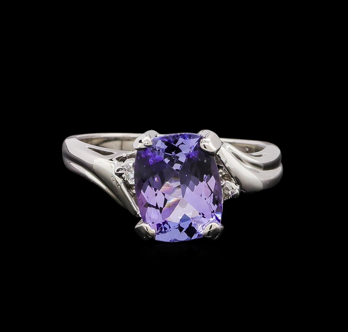 One electronically tested 14KT white gold ladies cast tanzanite and diamond ring with a bright polish finish. Identified with markings of "14K". Condition is new. Containing: One prong set rectangular cushion modified brilliant cut natural tanzanite, measuring 9.00 x 7.00 x 4.20mm, approximate weight of 2.08ct., clarity is eye clean, type I, medium, very slightly grayish, violet color, (GIA V 5/3), cut is good. Two prong set round brilliant cut diamonds, measuring 1.30 - 1.30 x 0.78mm (depth est.) approximate total weight of 2 Stones = 0.02ct. Clarity: SI-1 to SI-2. Color: H - I, Cut is Good. Colored gemstones are presumed to have been subjected to commonly used enhancement processes. All diamonds and colored gemstones are graded in the mounting, unless otherwise stated. Total Weight of Colored Stones 2.08ct. Total Weight of Diamonds 0.02ct. Total Weight of Ring 3.80 grams. GGL Appraised at $2,210.00.