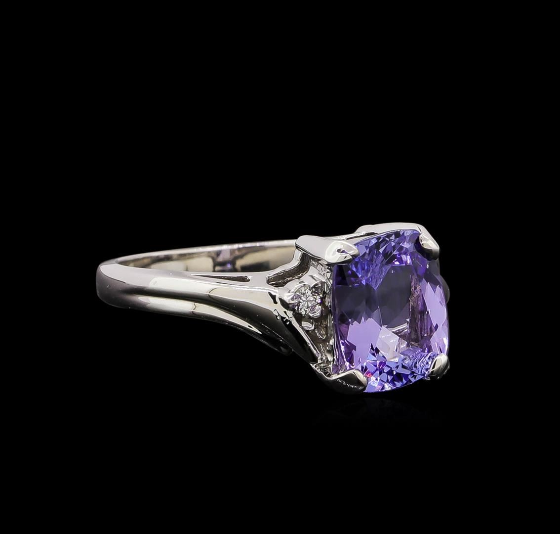 One electronically tested 14KT white gold ladies cast tanzanite and diamond ring with a bright polish finish. Identified with markings of "14K". Condition is new. Containing: One prong set rectangular cushion modified brilliant cut natural tanzanite, measuring 9.00 x 7.00 x 4.20mm, approximate weight of 2.08ct., clarity is eye clean, type I, medium, very slightly grayish, violet color, (GIA V 5/3), cut is good. Two prong set round brilliant cut diamonds, measuring 1.30 - 1.30 x 0.78mm (depth est.) approximate total weight of 2 Stones = 0.02ct. Clarity: SI-1 to SI-2. Color: H - I, Cut is Good. Colored gemstones are presumed to have been subjected to commonly used enhancement processes. All diamonds and colored gemstones are graded in the mounting, unless otherwise stated. Total Weight of Colored Stones 2.08ct. Total Weight of Diamonds 0.02ct. Total Weight of Ring 3.80 grams. GGL Appraised at $2,210.00.