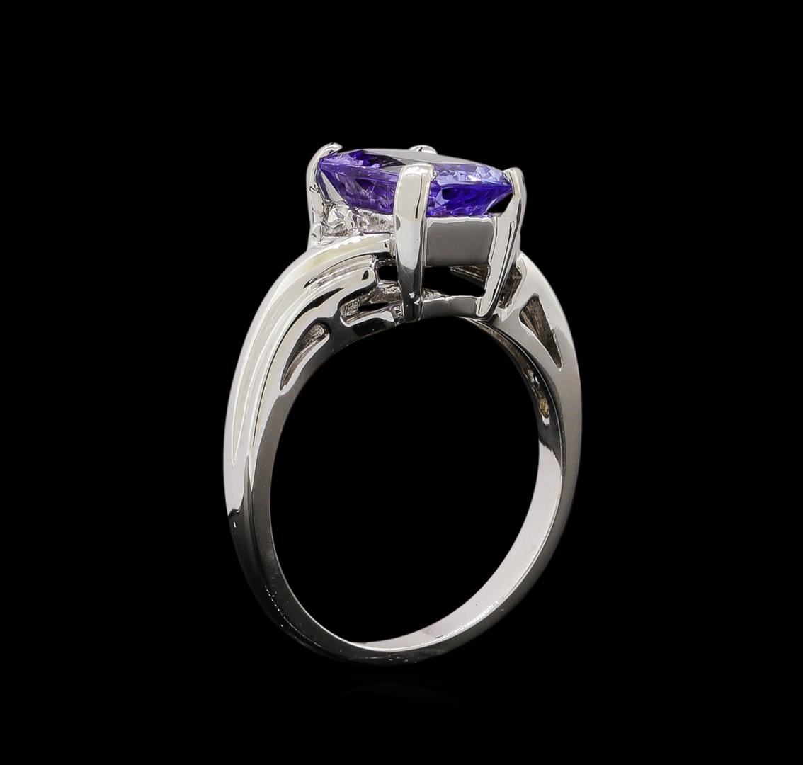 One electronically tested 14KT white gold ladies cast tanzanite and diamond ring with a bright polish finish. Identified with markings of "14K". Condition is new. Containing: One prong set rectangular cushion modified brilliant cut natural tanzanite, measuring 9.00 x 7.00 x 4.20mm, approximate weight of 2.08ct., clarity is eye clean, type I, medium, very slightly grayish, violet color, (GIA V 5/3), cut is good. Two prong set round brilliant cut diamonds, measuring 1.30 - 1.30 x 0.78mm (depth est.) approximate total weight of 2 Stones = 0.02ct. Clarity: SI-1 to SI-2. Color: H - I, Cut is Good. Colored gemstones are presumed to have been subjected to commonly used enhancement processes. All diamonds and colored gemstones are graded in the mounting, unless otherwise stated. Total Weight of Colored Stones 2.08ct. Total Weight of Diamonds 0.02ct. Total Weight of Ring 3.80 grams. GGL Appraised at $2,210.00.