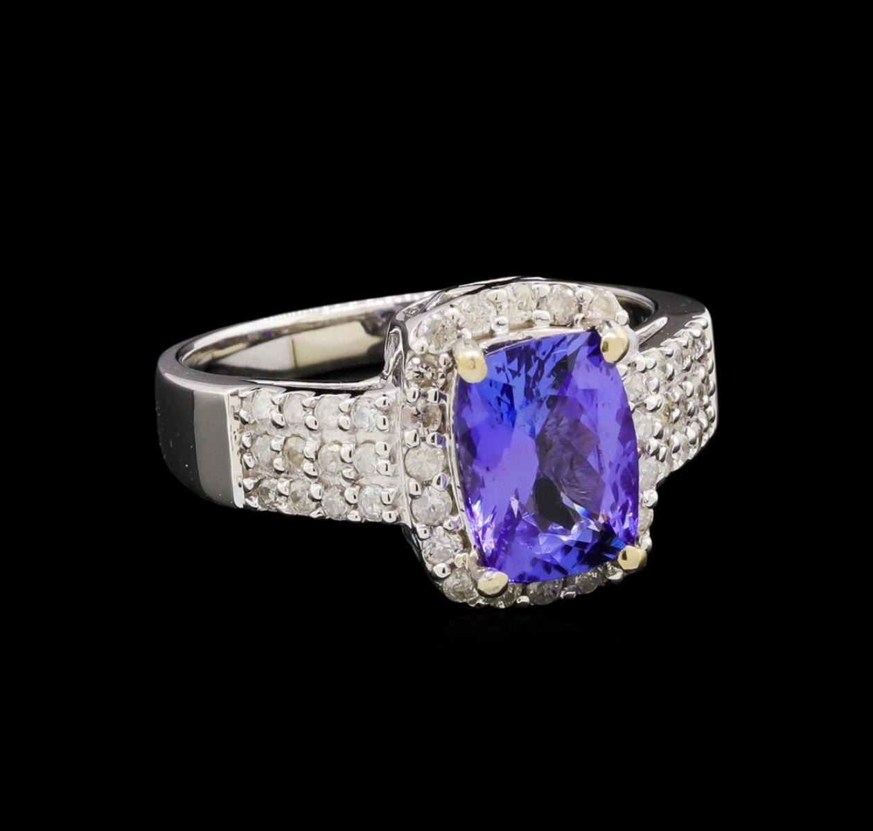 One electronically tested 14KT white gold ladies combination cast & assembled tanzanite and diamond ring with a flat shank with a bright polish finish. Identified with markings of "14K". Condition is new. Containing: One prong set rectangular cushion modified brilliant cut natural tanzanite, measuring 9.00 x 6.85 x 4.28mm, approximate weight of 2.08ct., clarity is eye clean, type I, medium light, moderately strong, violet color, (GIA V 4/4), cut is good. Twenty-Three prong set round brilliant cut diamonds, measuring 1.50 - 1.50 x 0.90mm (depth est.) approximate total weight of 23 Stones = 0.28ct. Clarity: I-1 to I-3. Color: I - J, Cut is Good. Colored gemstones are presumed to have been subjected to commonly used enhancement processes. All diamonds and colored gemstones are graded in the mounting, unless otherwise stated. Total Weight of Colored Stones 2.08ct. Total Weight of Diamonds 0.28ct. Total Weight of Ring 5.20 grams. GGL Appraised.