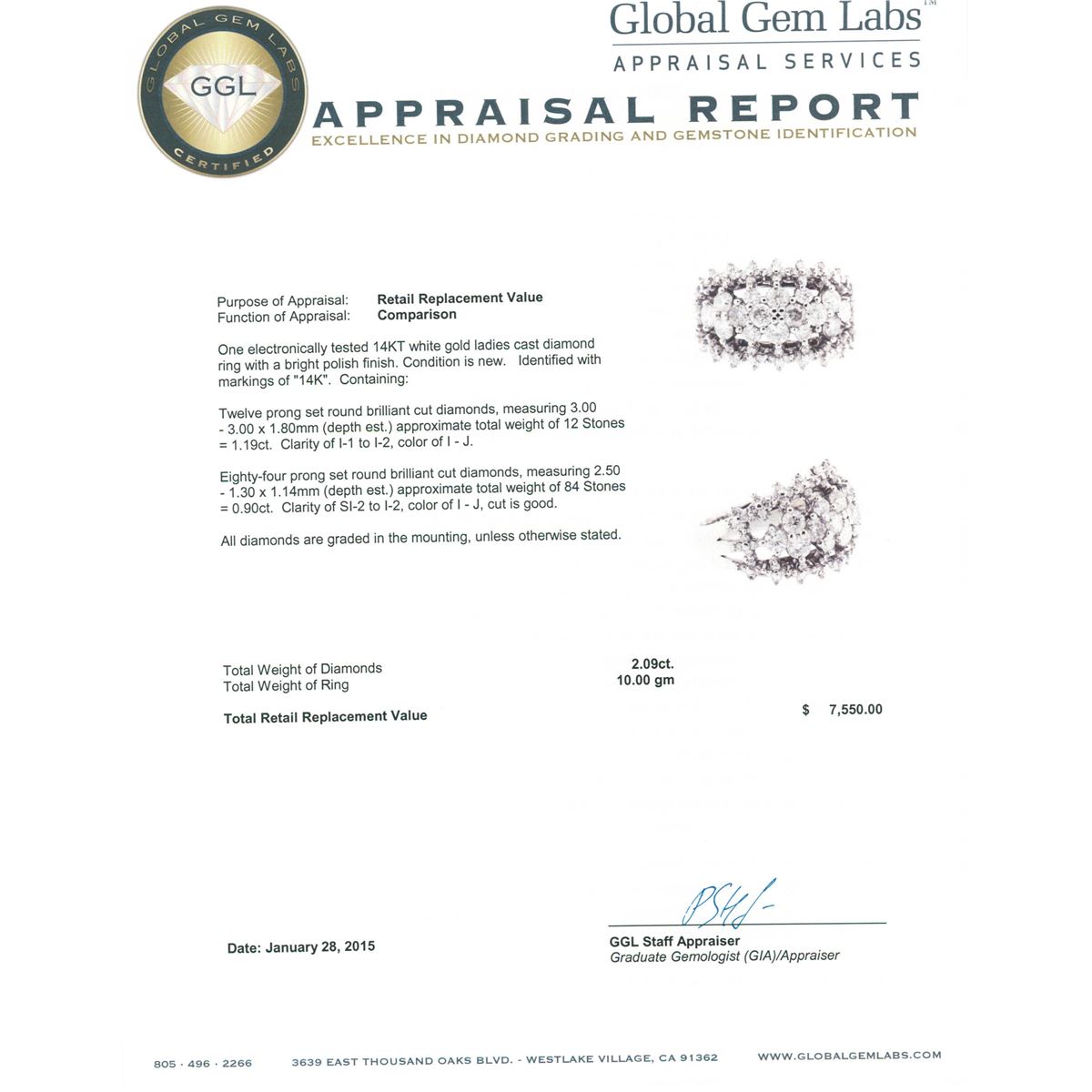 One electronically tested 14KT white gold ladies cast diamond ring with a bright polish finish. Identified with markings of "14K". Condition is new. Containing: Twelve prong set round brilliant cut diamonds, measuring 3.00 - 3.00 x 1.80mm (depth est.) approximate total weight of 12 Stones = 1.19ct. Clarity: I-1 to I-2. Color: I - J. Eighty-Four prong set round brilliant cut diamonds, measuring 2.50 - 1.30 x 1.14mm (depth est.) approximate total weight of 84 Stones = 0.90ct. Clarity: SI-2 to I-2. Color: I - J, Cut is Good. All diamonds are graded in the mounting, unless otherwise stated. Total Weight of Diamonds 2.09ct. Total Weight of Ring 10.00 grams. GGL Appraised at $7,550.00.
