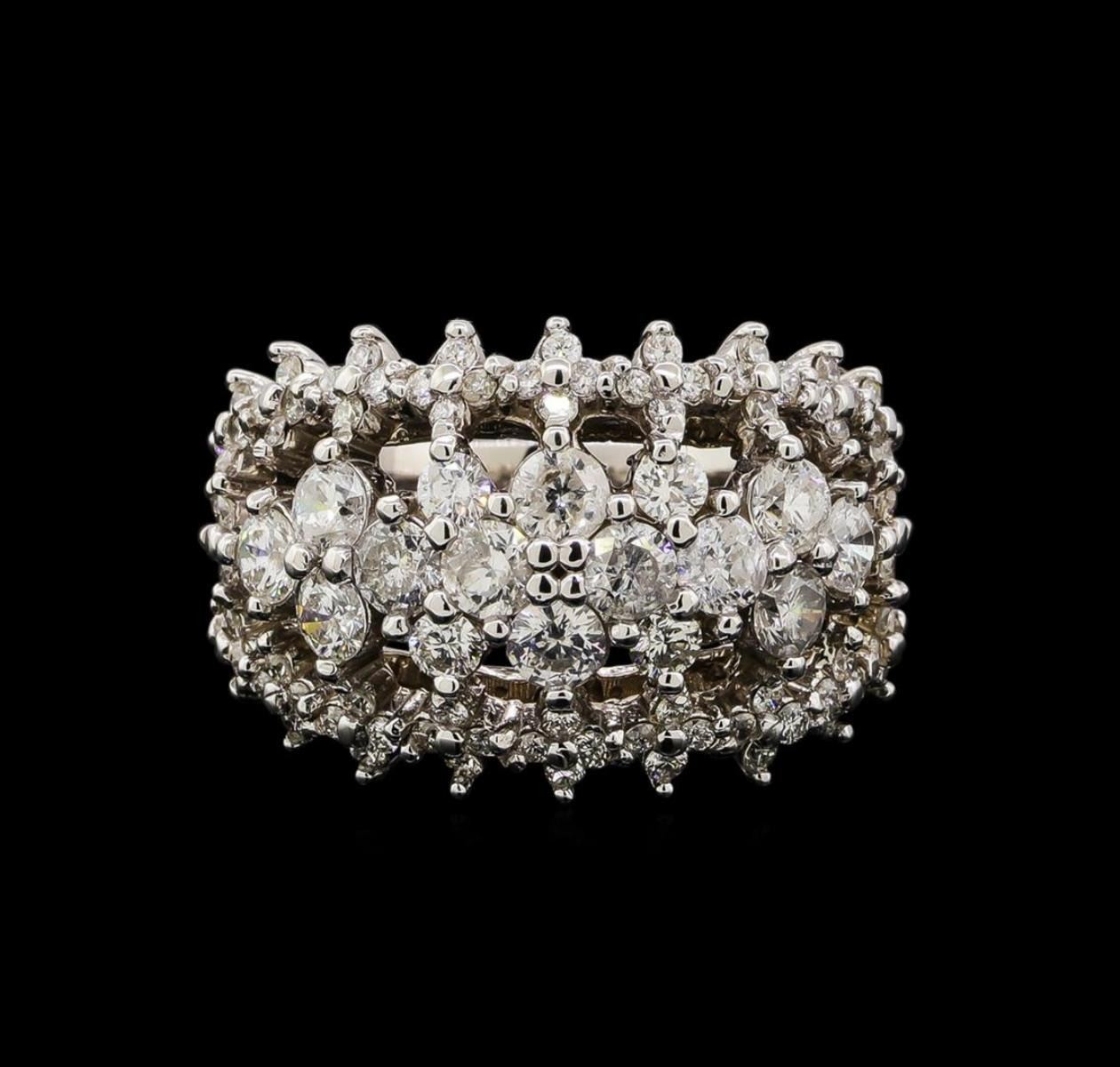 One electronically tested 14KT white gold ladies cast diamond ring with a bright polish finish. Identified with markings of "14K". Condition is new. Containing: Twelve prong set round brilliant cut diamonds, measuring 3.00 - 3.00 x 1.80mm (depth est.) approximate total weight of 12 Stones = 1.19ct. Clarity: I-1 to I-2. Color: I - J. Eighty-Four prong set round brilliant cut diamonds, measuring 2.50 - 1.30 x 1.14mm (depth est.) approximate total weight of 84 Stones = 0.90ct. Clarity: SI-2 to I-2. Color: I - J, Cut is Good. All diamonds are graded in the mounting, unless otherwise stated. Total Weight of Diamonds 2.09ct. Total Weight of Ring 10.00 grams. GGL Appraised at $7,550.00.