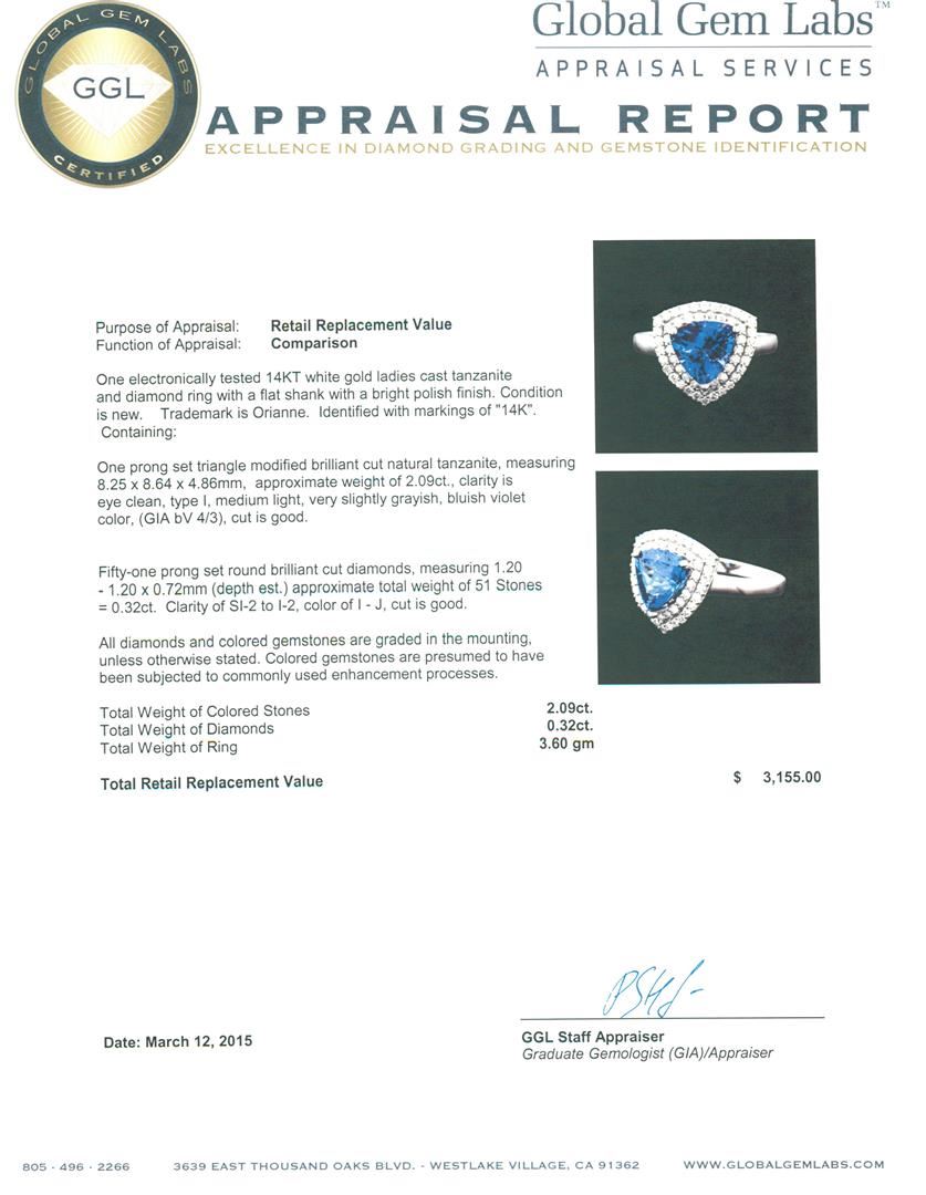 One electronically tested 14KT white gold ladies cast tanzanite and diamond ring with a flat shank with a bright polish finish. Trademark is Orianne. Identified with markings of "14K". Condition is new. Containing: One prong set triangle modified brilliant cut natural tanzanite, measuring 8.25 x 8.64 x 4.86mm, approximate weight of 2.09ct., clarity is eye clean, type I, medium light, very slightly grayish, bluish violet color, (GIA bV 4/3), cut is good. Fifty-One prong set round brilliant cut diamonds, measuring 1.20 - 1.20 x 0.72mm (depth est.) approximate total weight of 51 Stones = 0.32ct. Clarity: SI-2 to I-2. Color: I - J, Cut is Good. All diamonds and colored gemstones are graded in the mounting, unless otherwise stated. Colored gemstones are presumed to have been subjected to commonly used enhancement processes. Total Weight of Colored Stones 2.09ct. Total Weight of Diamonds 0.32ct. Total Weight of Ring 3.60 grams. GGL Appraised at $3,155.00.