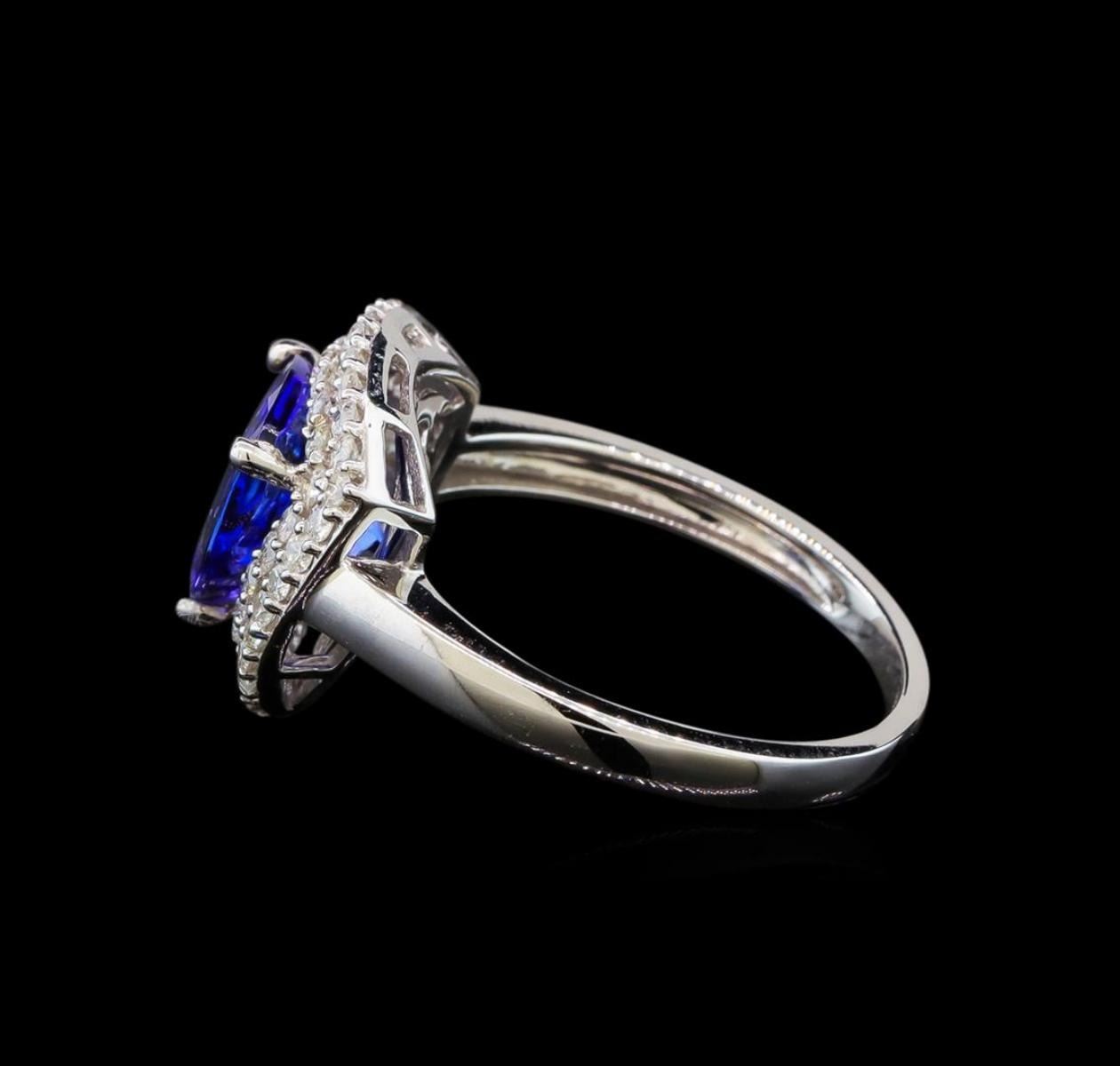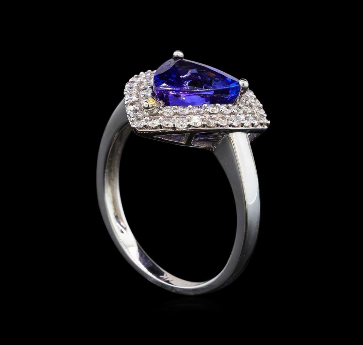 One electronically tested 14KT white gold ladies cast tanzanite and diamond ring with a flat shank with a bright polish finish. Trademark is Orianne. Identified with markings of "14K". Condition is new. Containing: One prong set triangle modified brilliant cut natural tanzanite, measuring 8.25 x 8.64 x 4.86mm, approximate weight of 2.09ct., clarity is eye clean, type I, medium light, very slightly grayish, bluish violet color, (GIA bV 4/3), cut is good. Fifty-One prong set round brilliant cut diamonds, measuring 1.20 - 1.20 x 0.72mm (depth est.) approximate total weight of 51 Stones = 0.32ct. Clarity: SI-2 to I-2. Color: I - J, Cut is Good. All diamonds and colored gemstones are graded in the mounting, unless otherwise stated. Colored gemstones are presumed to have been subjected to commonly used enhancement processes. Total Weight of Colored Stones 2.09ct. Total Weight of Diamonds 0.32ct. Total Weight of Ring 3.60 grams. GGL Appraised.