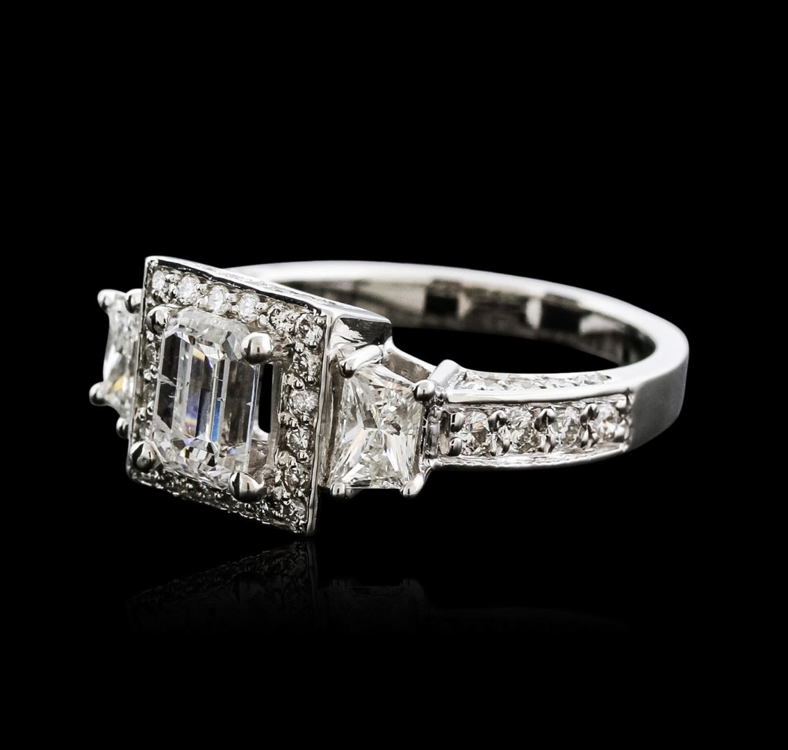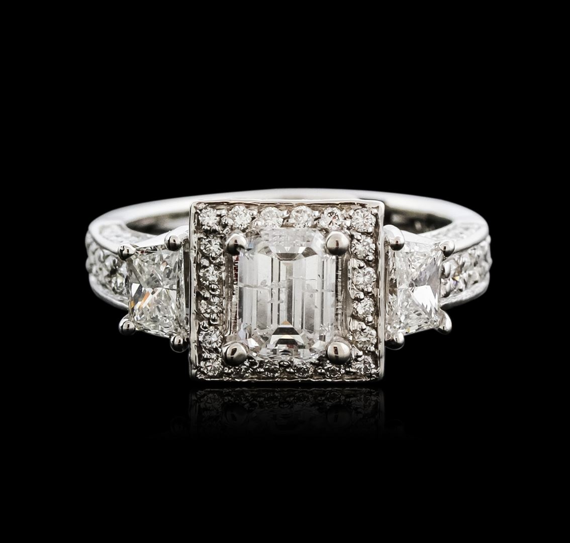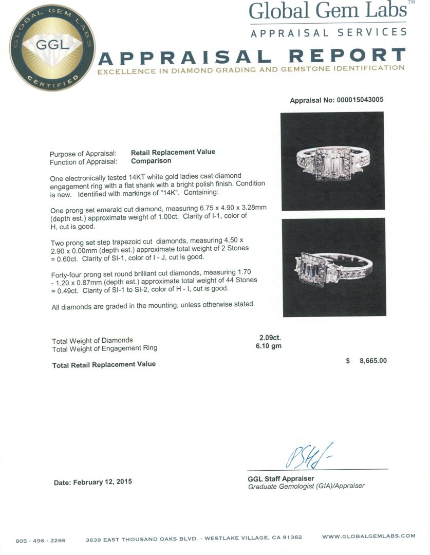 One electronically tested 14KT white gold ladies cast diamond engagement ring with a flat shank with a bright polish finish. Identified with markings of "14K". Condition is new. Containing: One prong set emerald cut diamond, measuring 6.75 x 4.90 x 3.28mm (depth est.) approximate weight of 1.00ct. Clarity: I-1. Color: H, Cut is Good. Two prong set step trapezoid cut diamonds, measuring 4.50 x 2.90 x 0.00mm (depth est.) approximate total weight of 2 Stones = 0.60ct. Clarity: SI-1. Color: I - J, Cut is Good. Forty-Four prong set round brilliant cut diamonds, measuring 1.70 - 1.20 x 0.87mm (depth est.) approximate total weight of 44 Stones = 0.49ct. Clarity: SI-1 to SI-2. Color: H - I, Cut is Good. All diamonds are graded in the mounting, unless otherwise stated. Total Weight of Diamonds 2.09ct. Total Weight of Engagement Ring 6.10 grams. GGL Appraised at $8,665.00.