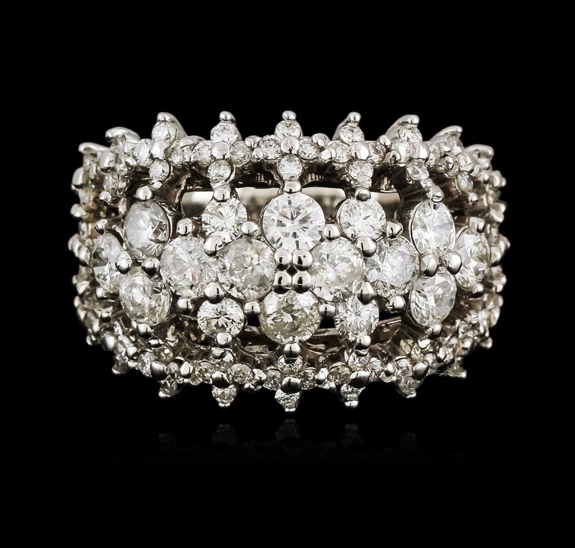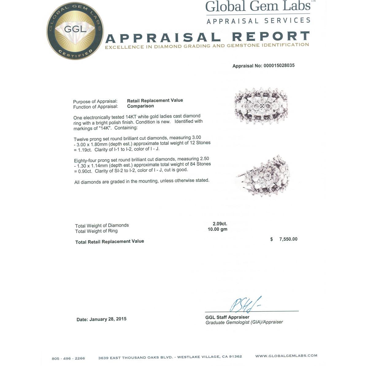 One electronically tested 14KT white gold ladies cast diamond ring with a bright polish finish. Identified with markings of "14K". Condition is new. Containing: Twelve prong set round brilliant cut diamonds, measuring 3.00 - 3.00 x 1.80mm (depth est.) approximate total weight of 12 Stones = 1.19ct. Clarity: I-1 to I-2. Color: I - J. Eighty-Four prong set round brilliant cut diamonds, measuring 2.50 - 1.30 x 1.14mm (depth est.) approximate total weight of 84 Stones = 0.90ct. Clarity: SI-2 to I-2. Color: I - J, Cut is Good. All diamonds are graded in the mounting, unless otherwise stated. Total Weight of Diamonds 2.09ct. Total Weight of Ring 10.00 grams. GGL Appraised at $7,550.00.