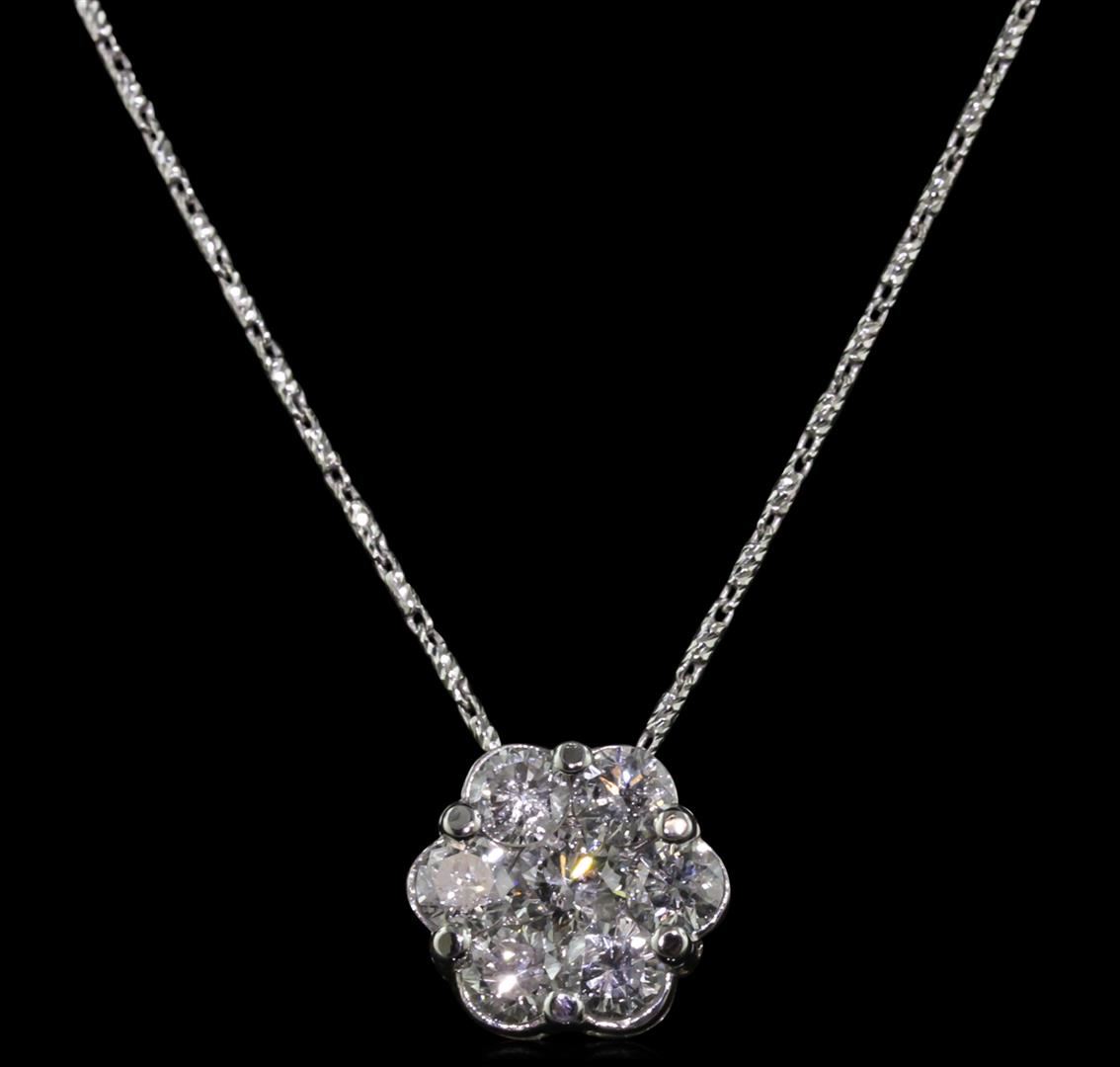 One electronically tested 14KT white gold ladies combination cast & assembled diamond pendant & chain 18.0" long, medium fancy link with a lobster claw clasp with a bright polish finish. Identified with markings of "14K". Condition is new. Containing: Seven prong set round brilliant cut diamonds, measuring 5.00 - 4.00 x 2.70mm (depth est.) approximate total weight of 7 Stones = 2.10ct. Clarity: SI-1 to SI-2. Color: I - J, Cut is Good. All diamonds are graded in the mounting, unless otherwise stated. Total Weight of Diamonds 2.10ct. Total Weight of Pendant & Chain 6.40 grams. GGL Appraised at $13,945.00.