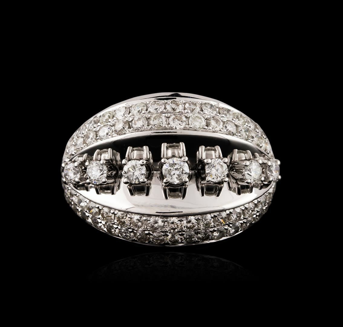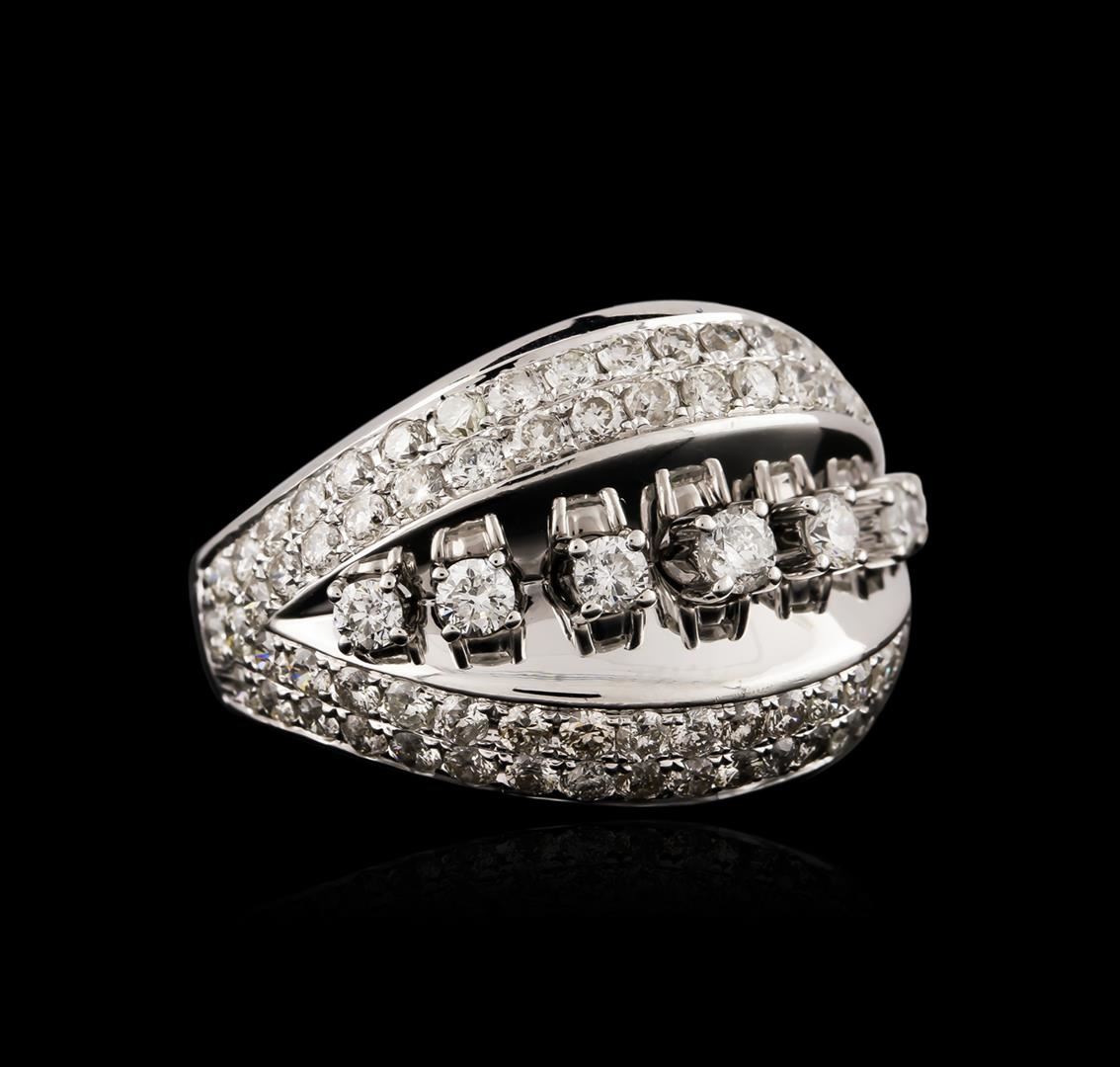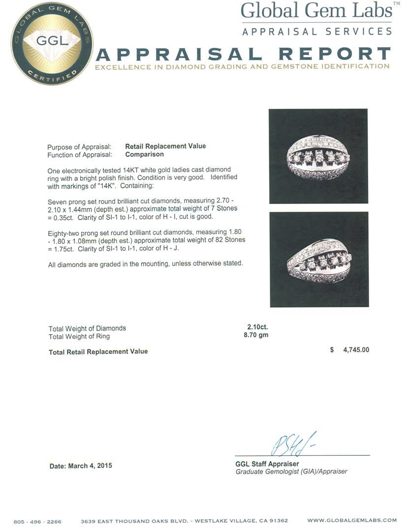 One electronically tested 14KT white gold ladies cast diamond ring with a bright polish finish. Identified with markings of "14K". Condition is very good. Containing: Seven prong set round brilliant cut diamonds, measuring 2.70 - 2.10 x 1.44mm (depth est.) approximate total weight of 7 Stones = 0.35ct. Clarity: SI-1 to I-1. Color: H - I, Cut is Good. Eighty-Two prong set round brilliant cut diamonds, measuring 1.80 - 1.80 x 1.08mm (depth est.) approximate total weight of 82 Stones = 1.75ct. Clarity: SI-1 to I-1. Color: H - J. All diamonds are graded in the mounting, unless otherwise stated. Total Weight of Diamonds 2.10ct. Total Weight of Ring 8.70 grams. GGL Appraised at $4,745.00.