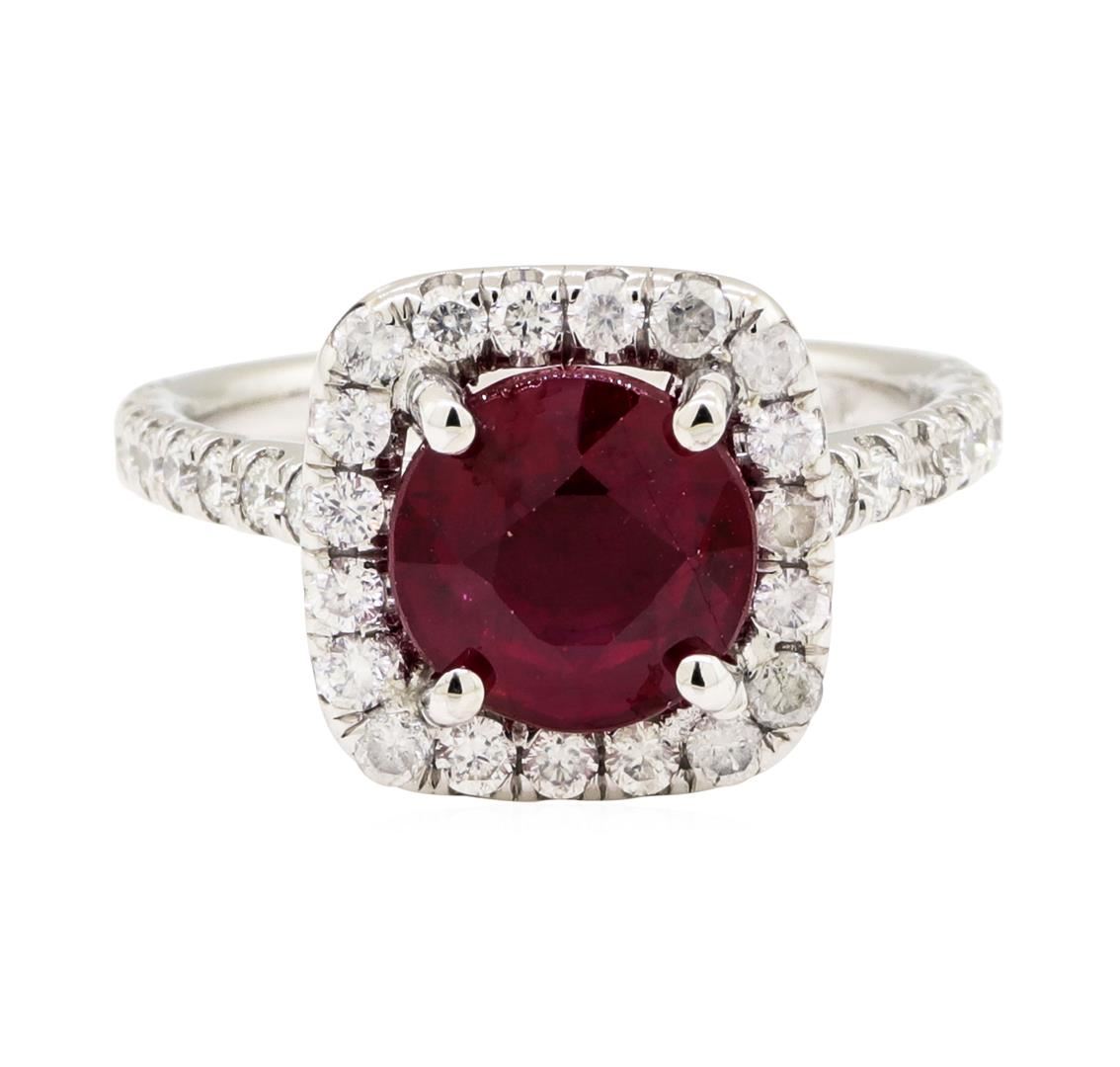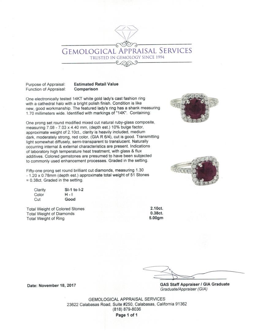 One electronically tested 14KT white gold lady's cast fashion ring with a cathedral halo with a bright polish finish. The featured lady's ring has a shank measuring 1.70 millimeters wide. Identified with markings of '14K'. Condition is like new, good workmanship. Containing: One prong set round modified mixed cut natural ruby-glass composite, measuring 7.08 - 7.03 x 4.40 mm, (depth est.) 10%. bulge factor, approximate weight of 2.10ct., clarity is heavily included, medium dark, moderately strong, red color, (GIA R 6/4), cut is good. Transmitting light somewhat diffusely, semi-transparent to translucent. Naturally occurring internal & external characteristics are present. Indications of laboratory high temperature heat treatment, with glass & flux additives. Colored gemstones are presumed to have been subjected to commonly used enhancement processes. Graded in the setting. Fifty-One prong set round brilliant cut diamonds, measuring 1.30 - 1.20 x 0.78mm (depth est.) approximate total weight of 51 Stones = 0.38ct. Graded in the setting. Color H - I Clarity SI-1 to I-2 Cut Good. Total Weight of Colored Stones 2.10ct.. Total Weight of Diamonds 0.38ct.. Total Weight of Ring 5.00gm. GAS Appraised.