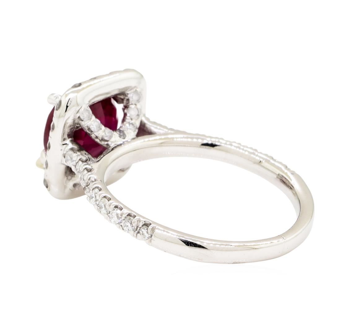One electronically tested 14KT white gold lady's cast fashion ring with a cathedral halo with a bright polish finish. The featured lady's ring has a shank measuring 1.70 millimeters wide. Identified with markings of '14K'. Condition is like new, good workmanship. Containing: One prong set round modified mixed cut natural ruby-glass composite, measuring 7.08 - 7.03 x 4.40 mm, (depth est.) 10%. bulge factor, approximate weight of 2.10ct., clarity is heavily included, medium dark, moderately strong, red color, (GIA R 6/4), cut is good. Transmitting light somewhat diffusely, semi-transparent to translucent. Naturally occurring internal & external characteristics are present. Indications of laboratory high temperature heat treatment, with glass & flux additives. Colored gemstones are presumed to have been subjected to commonly used enhancement processes. Graded in the setting. Fifty-One prong set round brilliant cut diamonds, measuring 1.30 - 1.20 x 0.78mm (depth est.) approximate total weight of 51 Stones = 0.38ct. Graded in the setting. Color H - I Clarity SI-1 to I-2 Cut Good. Total Weight of Colored Stones 2.10ct.. Total Weight of Diamonds 0.38ct.. Total Weight of Ring 5.00gm. GAS Appraised.