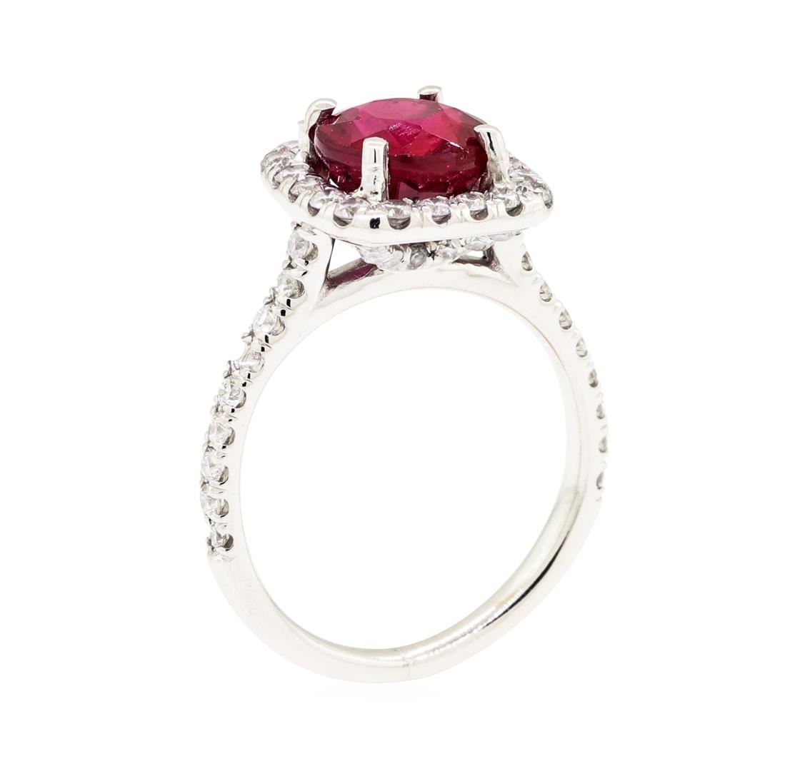 One electronically tested 14KT white gold lady's cast fashion ring with a cathedral halo with a bright polish finish. The featured lady's ring has a shank measuring 1.70 millimeters wide. Identified with markings of '14K'. Condition is like new, good workmanship. Containing: One prong set round modified mixed cut natural ruby-glass composite, measuring 7.08 - 7.03 x 4.40 mm, (depth est.) 10%. bulge factor, approximate weight of 2.10ct., clarity is heavily included, medium dark, moderately strong, red color, (GIA R 6/4), cut is good. Transmitting light somewhat diffusely, semi-transparent to translucent. Naturally occurring internal & external characteristics are present. Indications of laboratory high temperature heat treatment, with glass & flux additives. Colored gemstones are presumed to have been subjected to commonly used enhancement processes. Graded in the setting. Fifty-One prong set round brilliant cut diamonds, measuring 1.30 - 1.20 x 0.78mm (depth est.) approximate total weight of 51 Stones = 0.38ct. Graded in the setting. Color H - I Clarity SI-1 to I-2 Cut Good. Total Weight of Colored Stones 2.10ct.. Total Weight of Diamonds 0.38ct.. Total Weight of Ring 5.00gm. GAS Appraised.