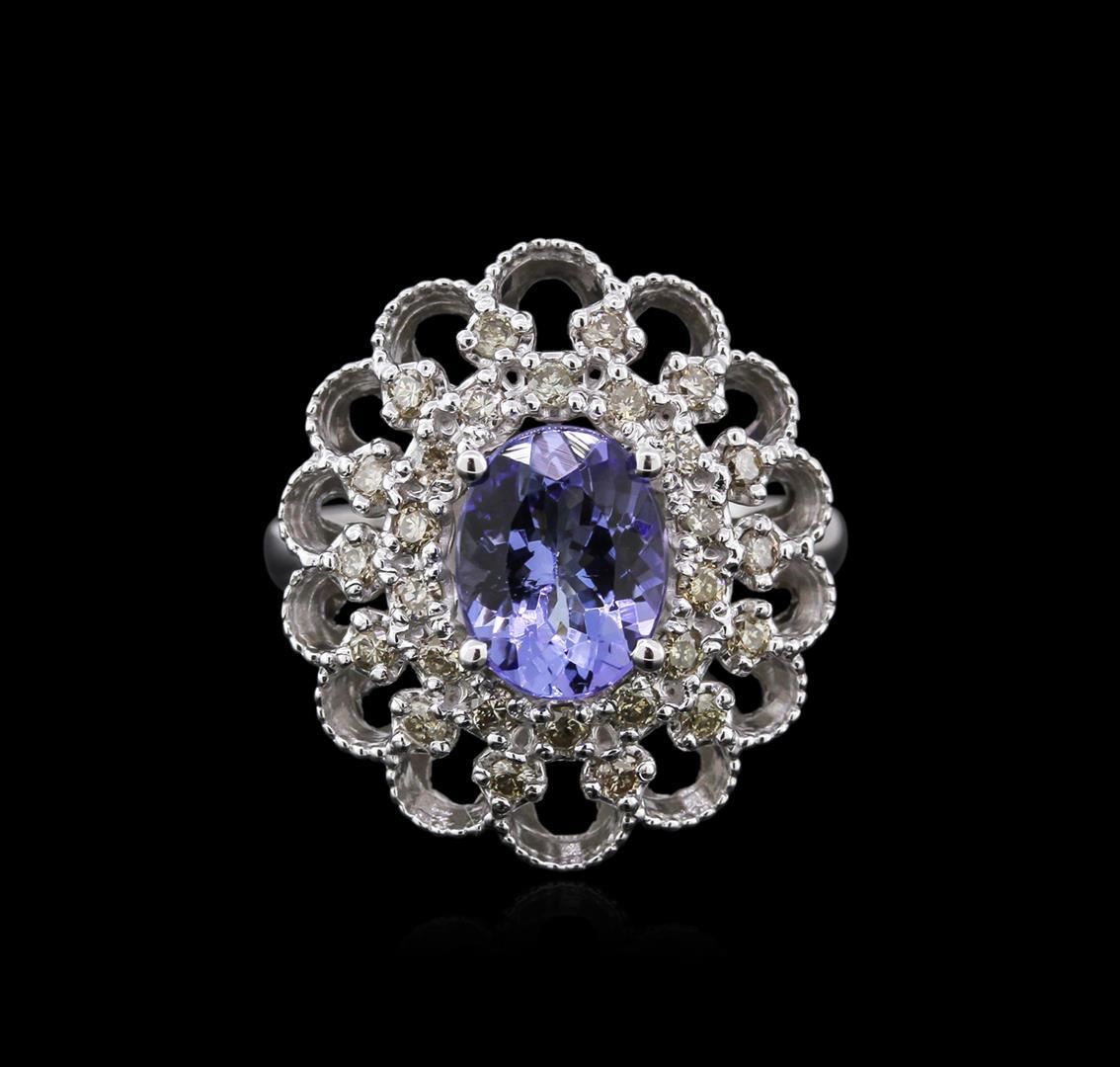 One electronically tested 14KT white gold ladies cast tanzanite and diamond ring with a tapered shank with a bright polish finish. Identified with markings of "14K". Condition is new. Containing: One prong set oval modified brilliant cut natural tanzanite, measuring 9.15 x 7.12 x 4.63mm, approximate weight of 2.12ct., clarity is eye clean, type I, medium light, very slightly grayish, violet color, (GIA V 4/3), cut is good. Twenty-Eight prong set round brilliant cut diamonds, measuring 1.40 - 1.40 x 0.84mm (depth est.) approximate total weight of 28 Stones = 0.28ct. Clarity: I-1 to I-2. Color: L - M, Cut is Good. Diamonds and colored gemstones are graded in the mounting, unless otherwise stated. Colored gemstones are presumed to have been subjected to commonly used enhancement processes. Total Weight of Colored Stones 2.12ct. Total Weight of Diamonds 0.28ct. Total Weight of Ring 8.30 grams. GGL Appraised.
