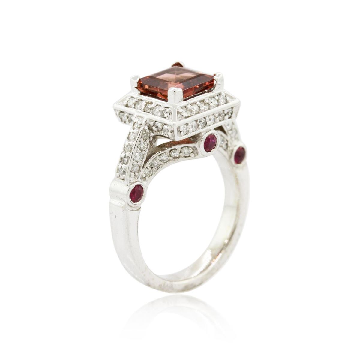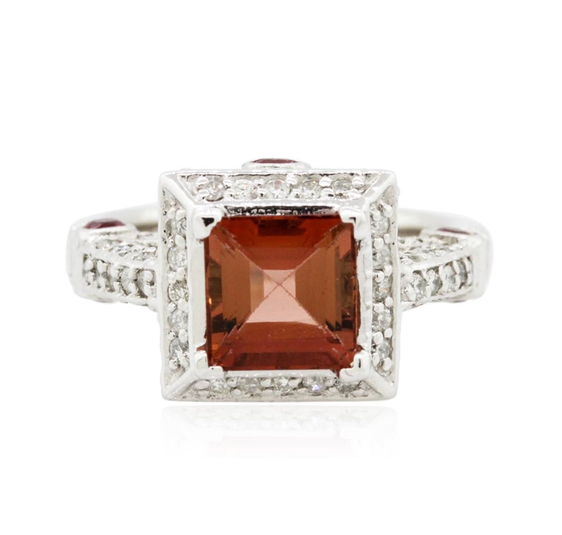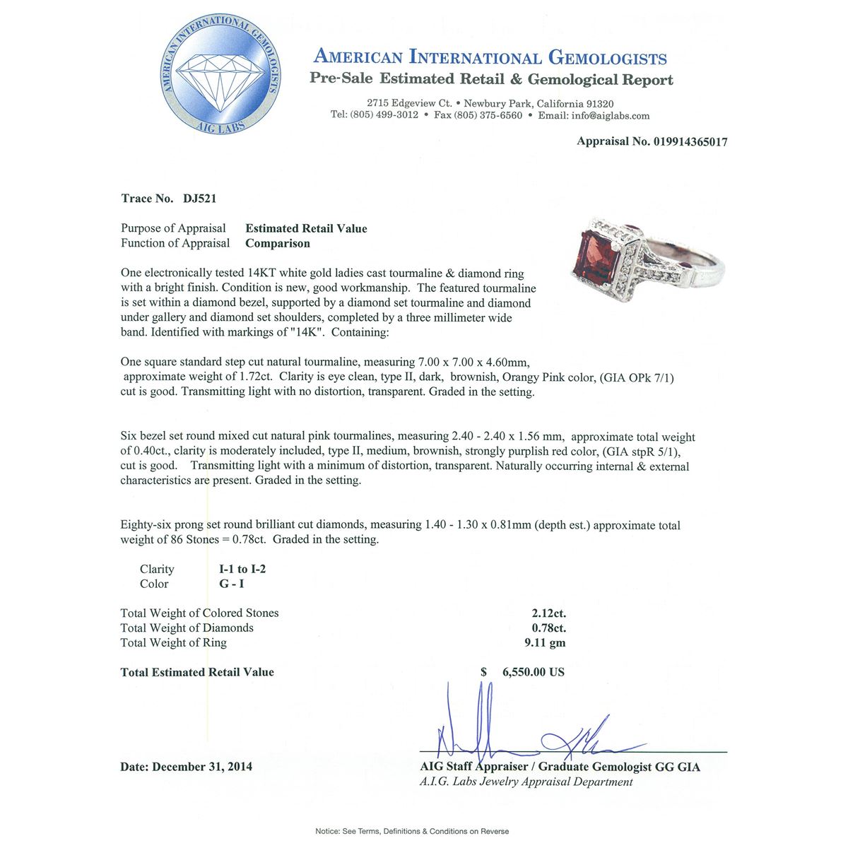 One electronically tested 14KT white gold ladies cast tourmaline & diamond ring with a bright finish. The featured tourmaline is set within a diamond bezel, supported by a diamond set tourmaline and diamond under gallery and diamond set shoulders, completed by a three millimeter wide band. Identified with markings of "14K". Condition is new, good workmanship. Containing: One square standard step cut natural tourmaline, measuring 7.00 x 7.00 x 4.60mm, approximate weight of 1.72ct. Clarity is eye clean, type II, dark, brownish, Orangy Pink color, (GIA OPk 7/1) cut is good. Transmitting light with no distortion, transparent. Graded in the setting. Six bezel set round mixed cut natural pink tourmalines, measuring 2.40 - 2.40 x 1.56 mm, approximate total weight of 0.40ct., clarity is moderately included, type II, medium, brownish, strongly purplish red color, (GIA stpR 5/1), cut is good. Transmitting light with a minimum of distortion, transparent. Naturally occurring internal & external characteristics are present. Graded in the setting. Eighty-Six prong set round brilliant cut diamonds, measuring 1.40 - 1.30 x 0.81mm (depth est.) approximate total weight of 86 Stones = 0.78ct. Graded in the setting. Clarity: I-1 to I-2. Color: G - I. Total Weight of Colored Stones 2.12ct. Total Weight of Diamonds 0.78ct. Total Weight of Ring 9.11 grams. AIG Appraised at $6,550.00.