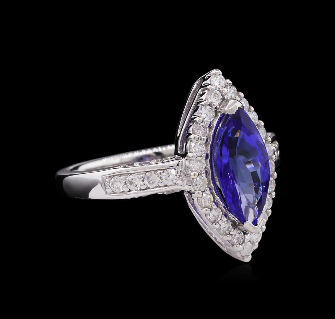 One electronically tested 14KT white gold Ladies combination cast & assembled ring with a bright polish finish. Condition is new. Identified with markings of "14K". Containing: One prong set marquise modified brilliant cut natural tanzanite, measuring 11.00 x 6.70 x 4.55mm, approximate weight of 2.13ct., clarity is eye clean, type I, medium, moderately strong, violet color, (GIA V 5/4), cut is good. Colored gemstones are presumed to have been subjected to commonly used color/clarity enhancement processes. Forty-Two prong set round brilliant cut diamonds, measuring 1.50 - 1.50 x 0.90mm (depth est.) approximate. Total Weight of 42 Stones = 0.63ct. Clarity: I-1 to I-2. Color: H - I, Cut is Good. Total Weight of Colored Stones 2.13ct. Total Weight of Diamonds 0.63ct. Total Weight of Ring 3.60 grams. GGL Appraised at $5,805.00.