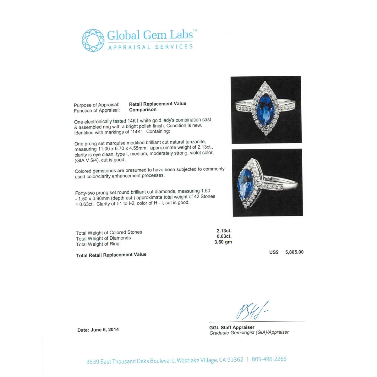 One electronically tested 14KT white gold Ladies combination cast & assembled ring with a bright polish finish. Condition is new. Identified with markings of "14K". Containing: One prong set marquise modified brilliant cut natural tanzanite, measuring 11.00 x 6.70 x 4.55mm, approximate weight of 2.13ct., clarity is eye clean, type I, medium, moderately strong, violet color, (GIA V 5/4), cut is good. Colored gemstones are presumed to have been subjected to commonly used color/clarity enhancement processes. Forty-Two prong set round brilliant cut diamonds, measuring 1.50 - 1.50 x 0.90mm (depth est.) approximate. Total Weight of 42 Stones = 0.63ct. Clarity: I-1 to I-2. Color: H - I, Cut is Good. Total Weight of Colored Stones 2.13ct. Total Weight of Diamonds 0.63ct. Total Weight of Ring 3.60 grams. GGL Appraised at $5,805.00.