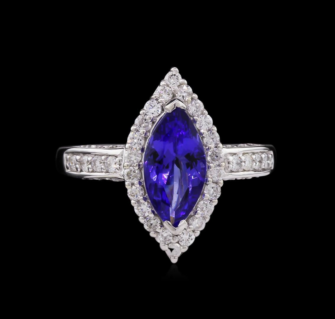 One electronically tested 14KT white gold Ladies combination cast & assembled ring with a bright polish finish. Condition is new. Identified with markings of "14K". Containing: One prong set marquise modified brilliant cut natural tanzanite, measuring 11.00 x 6.70 x 4.55mm, approximate weight of 2.13ct., clarity is eye clean, type I, medium, moderately strong, violet color, (GIA V 5/4), cut is good. Colored gemstones are presumed to have been subjected to commonly used color/clarity enhancement processes. Forty-Two prong set round brilliant cut diamonds, measuring 1.50 - 1.50 x 0.90mm (depth est.) approximate. Total Weight of 42 Stones = 0.63ct. Clarity: I-1 to I-2. Color: H - I, Cut is Good. Total Weight of Colored Stones 2.13ct. Total Weight of Diamonds 0.63ct. Total Weight of Ring 3.60 grams. GGL Appraised at $5,805.00.